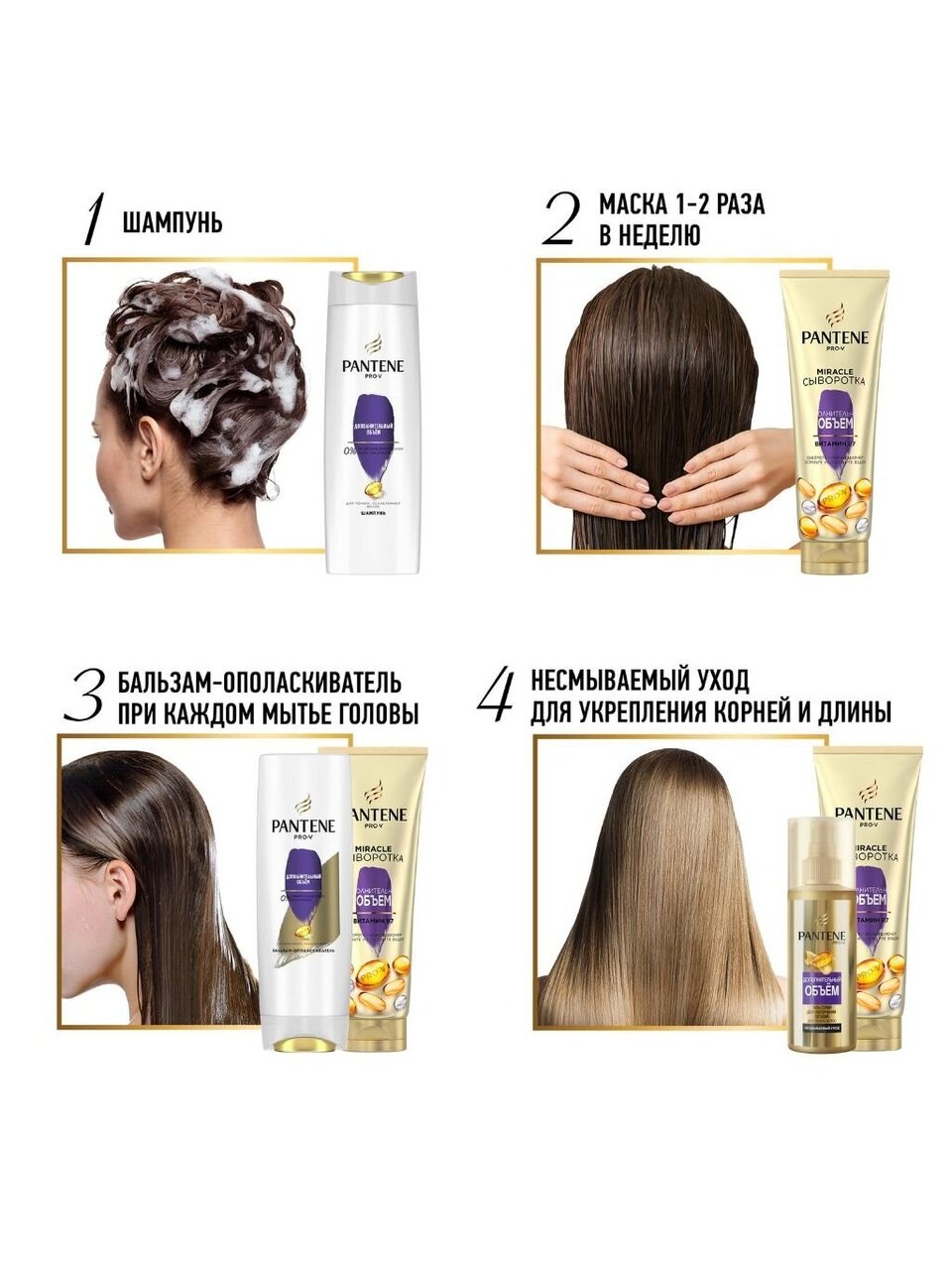 Шампунь, бальзам-ополаскиватель и уходовое средство Pantene Pro-V 3 в 1 Дополнительный Объем идеально подходит для тонких и ослабленных волос, лишенных объема. Благодаря уникальному комплексу Pro-V Это средство 3в1 деликатно очищает волосы, насыщая их активными питательными веществами, облегчает расчесывание и придает им объем без утяжеления. Его питательная формула придает тонким, ослабленным волосам здоровый сияющий внешний вид, визуальный объем и силу. Подходит для ежедневного применения, а также для окрашенных волос.