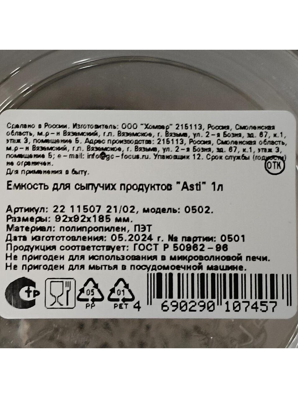 Вы можете приобрести «Банка для сыпучих продуктов, пластик, 1 л, 9.2х9.2х18.5 см, с крышкой, Homver, Asti, 50721/02, светло-серая» и другие товары в нашем интернет-магазине в Липецке по низким ценам и с бесплатным самовывозом.
