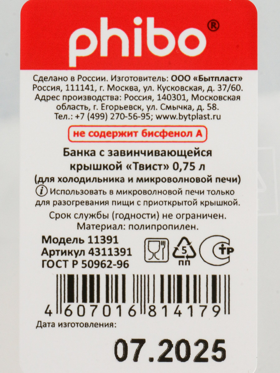 Банка для сыпучих продуктов 0.75 л Бытпласт Твист — компактное и герметичное решение для хранения круп, сахара и специй дома и на даче. Прозрачный пластик, надёжная крышка, лёгкая очистка.
