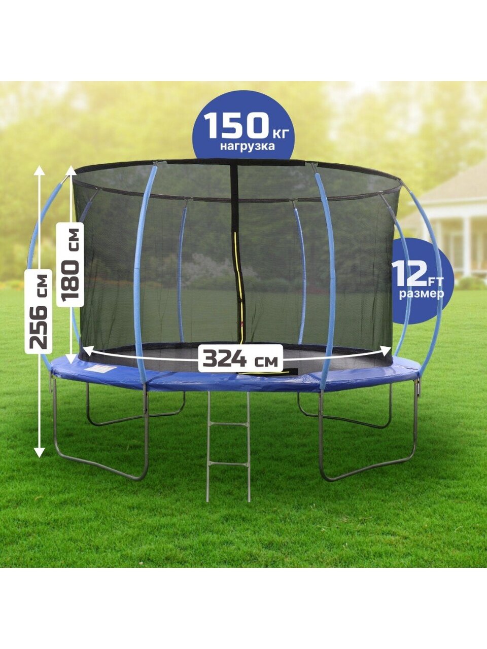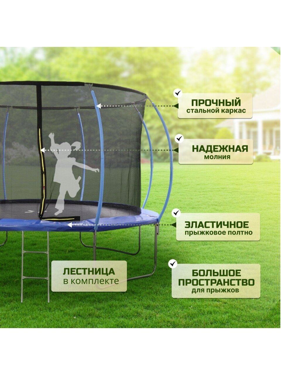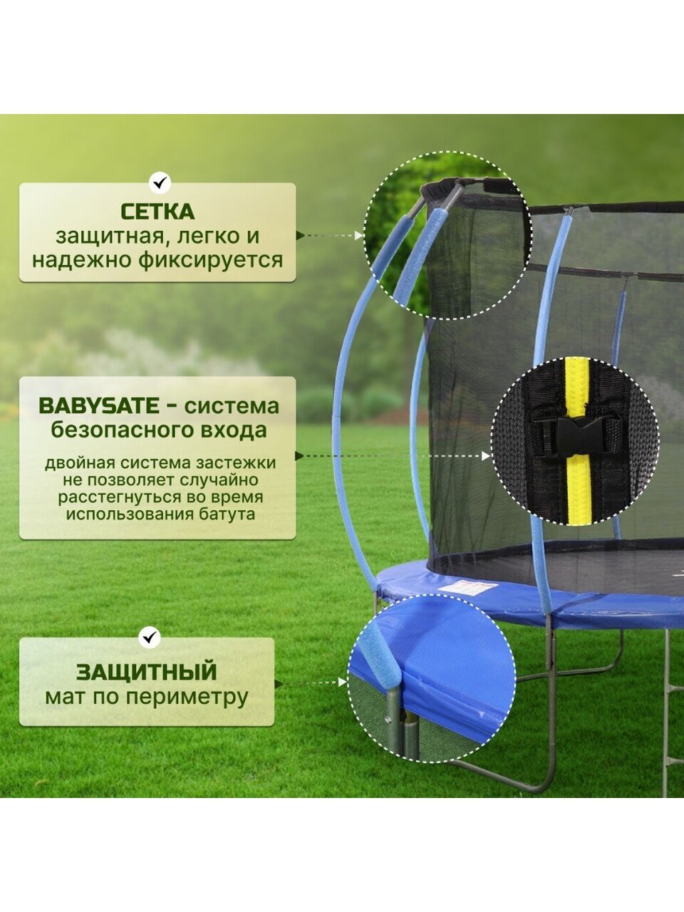 - Безопасность: защитная внутренняя сеть исключает падение с высоты, 3-слойный мат - соприкосновение с пружинным механизмом, двойная молния с фиксатором входа.