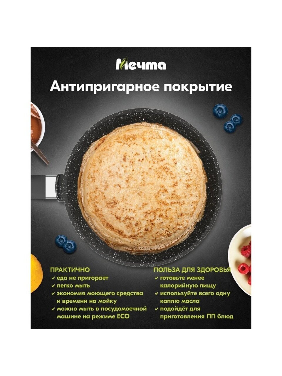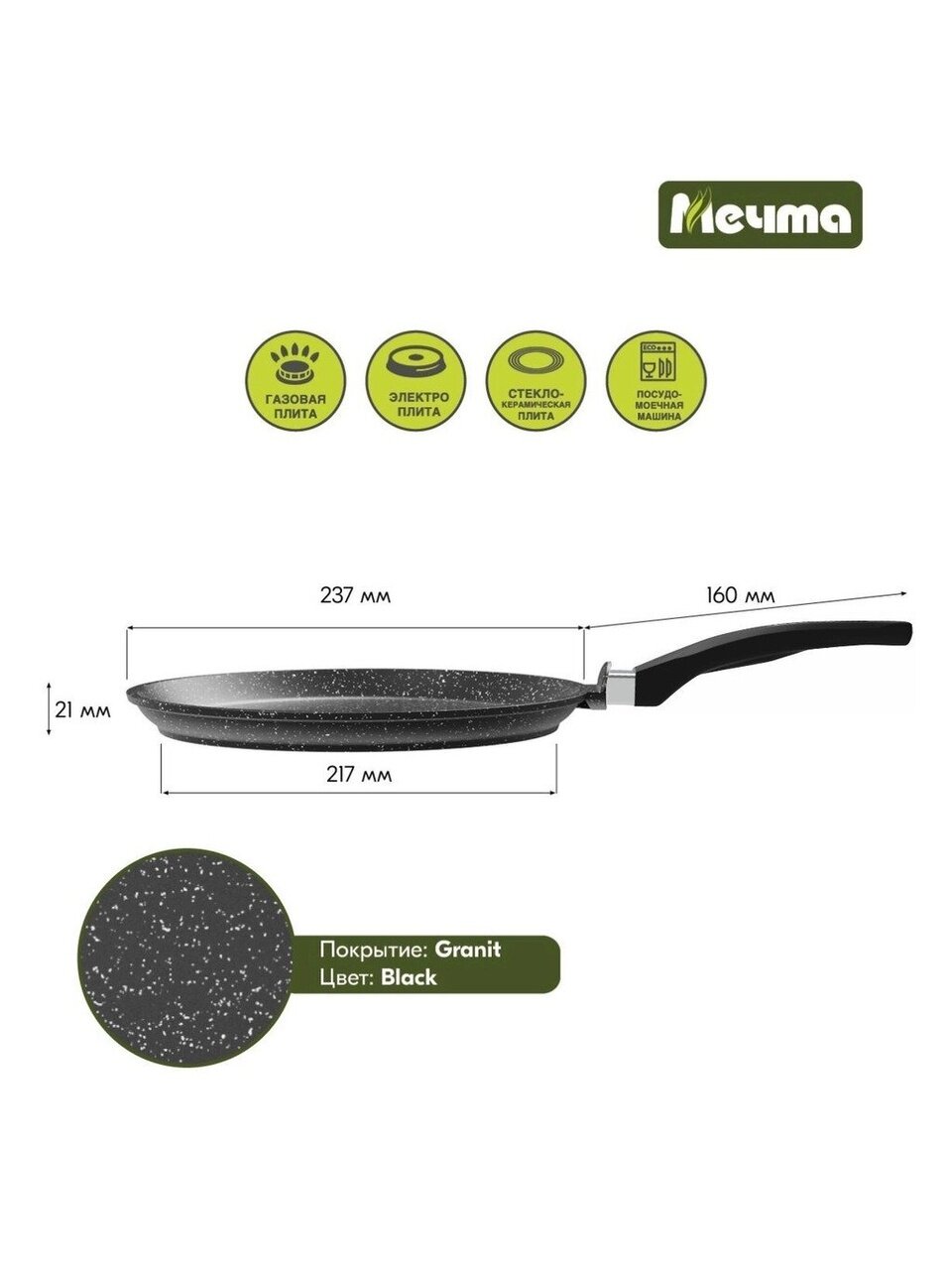 У каждой хозяйки должна быть сковорода блинница Гранит, предназначенная именно для выпечки блинов. Чтобы блинчики получались пышные и вкусные, а процесс приготовления не отнимал много времени и сил выбирайте сковороду блинную ТМ "Мечта" или блинницу гранит. Блинная сковорода - блинница Гранит с антипригарным покрытием имеет толстое дно, невысокие бортики и удобную ручку. Сковорода блинница гранит из литого высококачественного пищевого алюминия "Мечта" станет незаменимым инструментом и надежным помощником на вашей кухне.