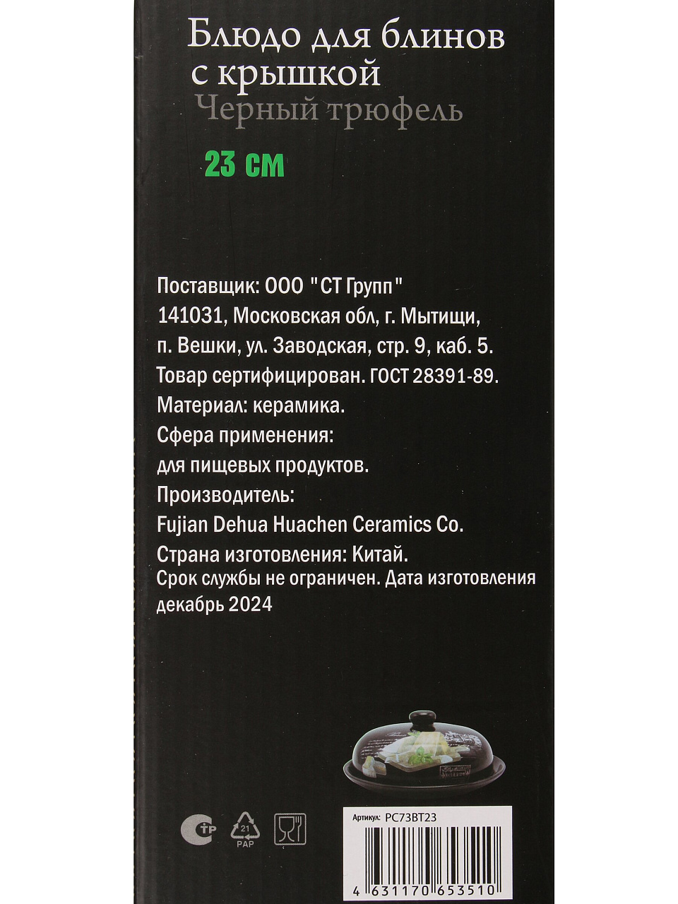 - Оптимальный диаметр 23 см, прочная керамика, бортики и защитная крышка — удобно для торта, блинов, закусок.