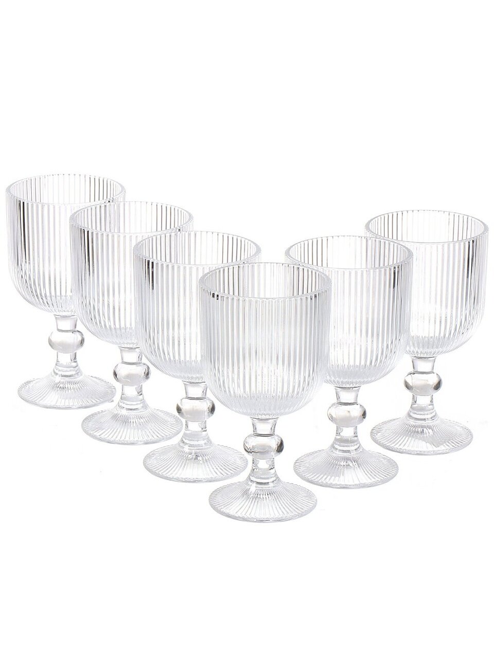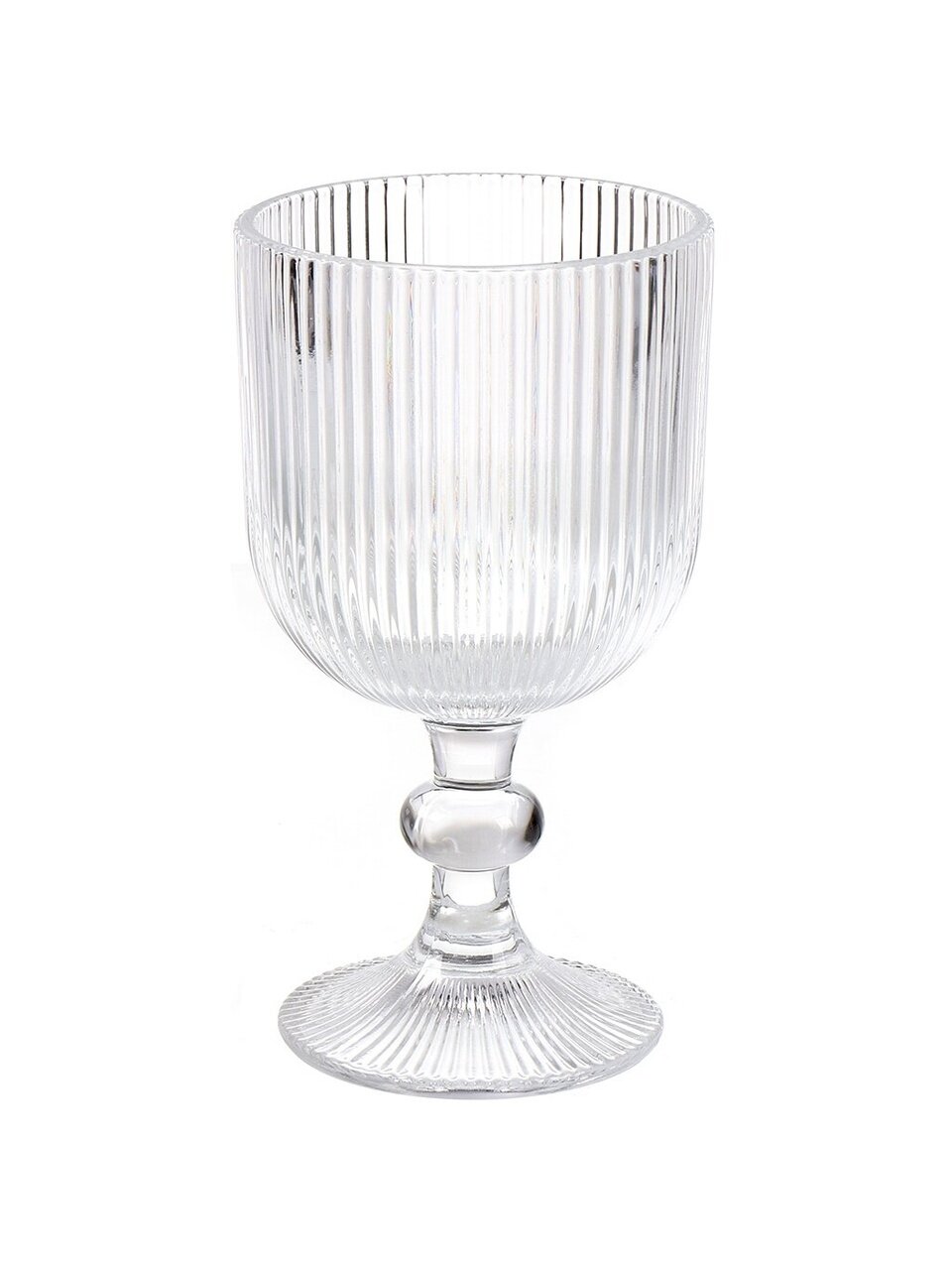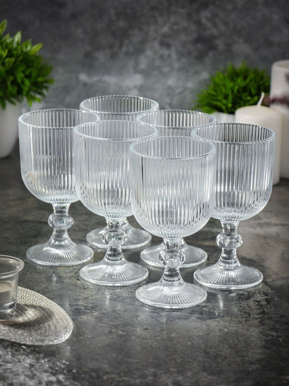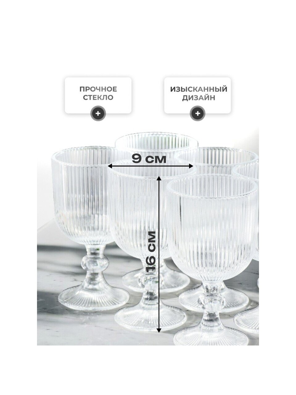 Каждый бокал рассчитан на 350 мл, выполнен из прессованного стекла с рельефным узором, что делает их прочными и эстетичными.