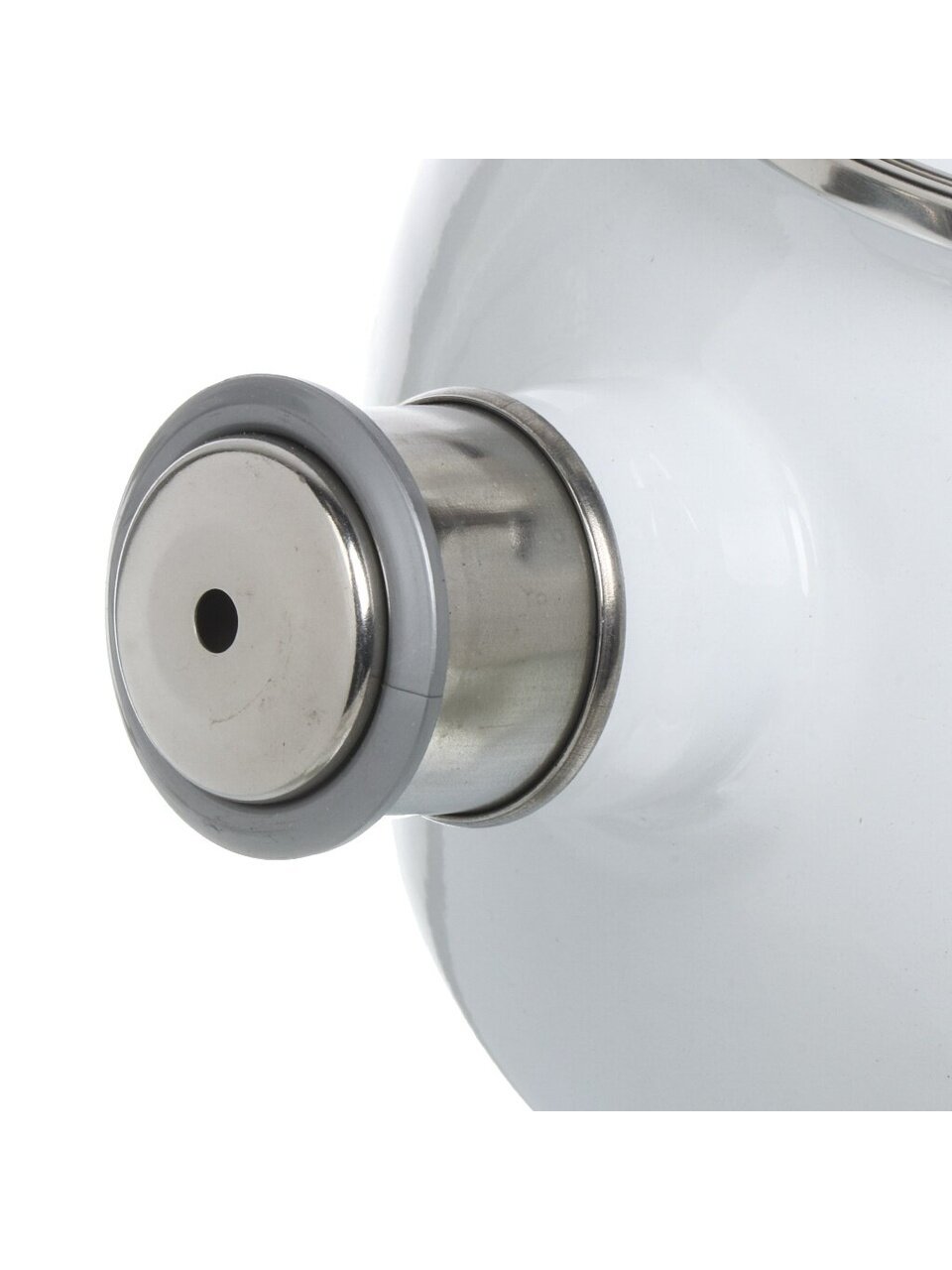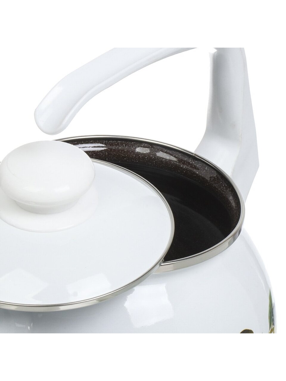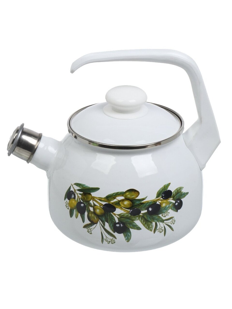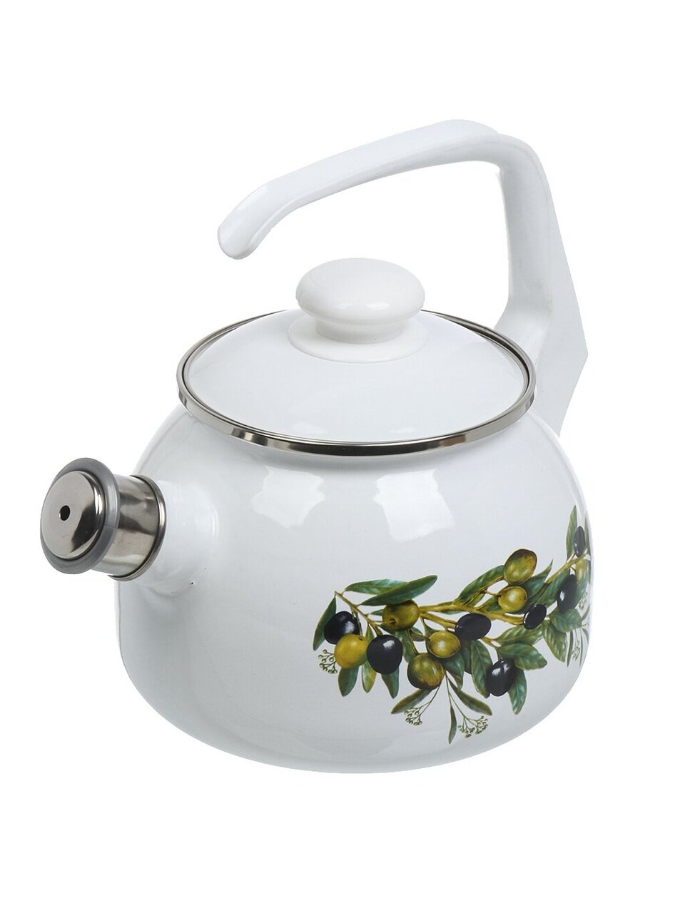 Чайник объемом 2.5 литра выполнен из прочной стали с эмалированным покрытием, что гарантирует долгий срок службы и легкость в уходе. Белый цвет корпуса с декоративными элементами в виде оливковых ветвей придает ему элегантность и свежесть. Чайник оснащен свистком, который своевременно оповестит о закипании воды, а удобная кнопка на ручке позволяет легко открывать крышку, не обжигая руки.