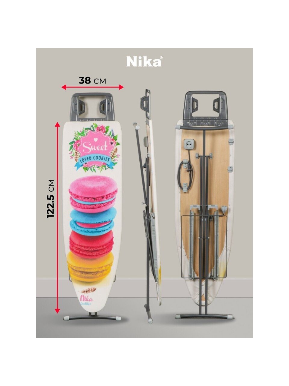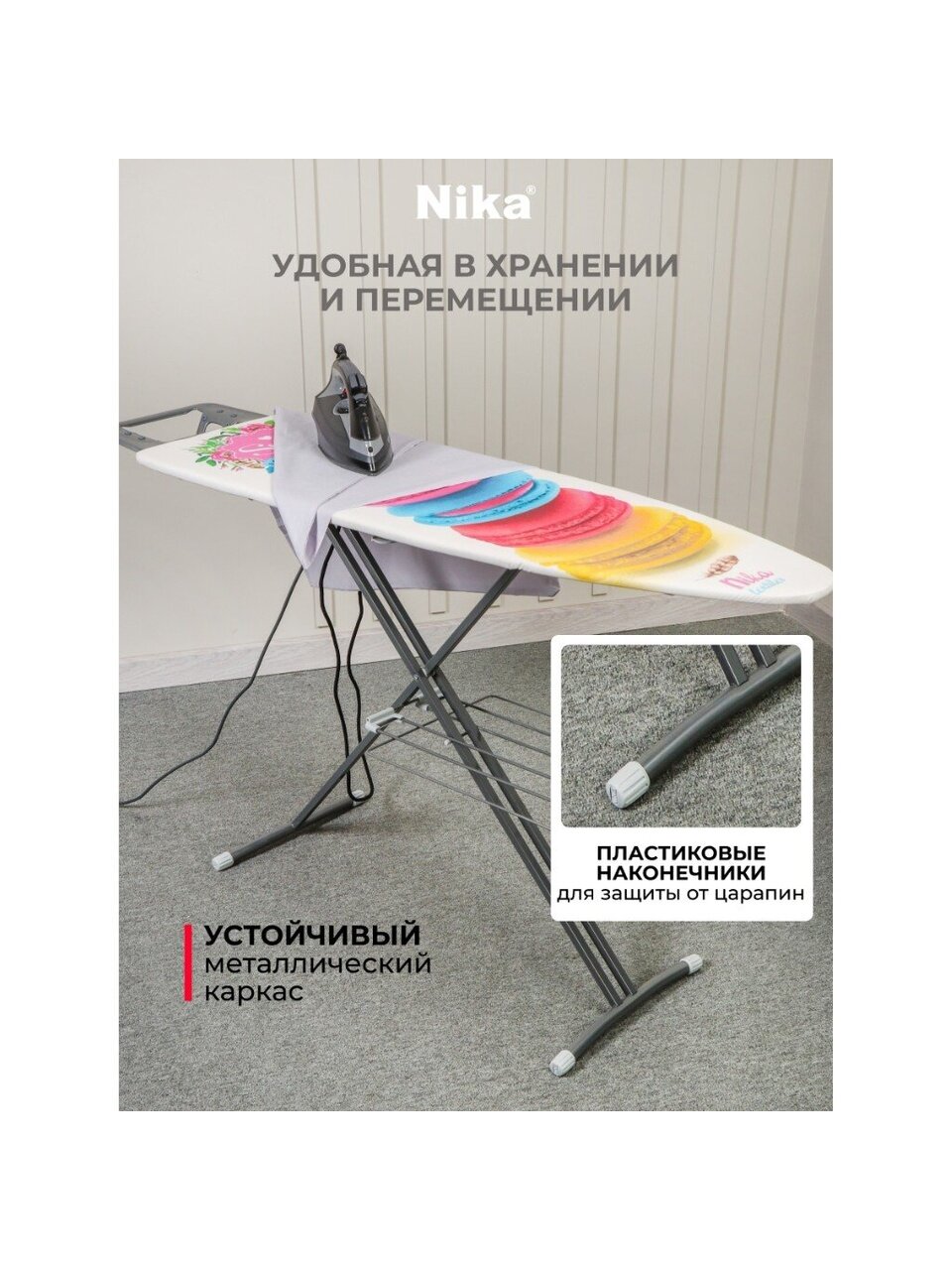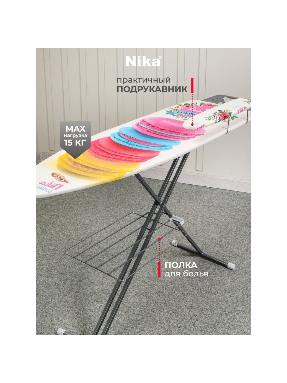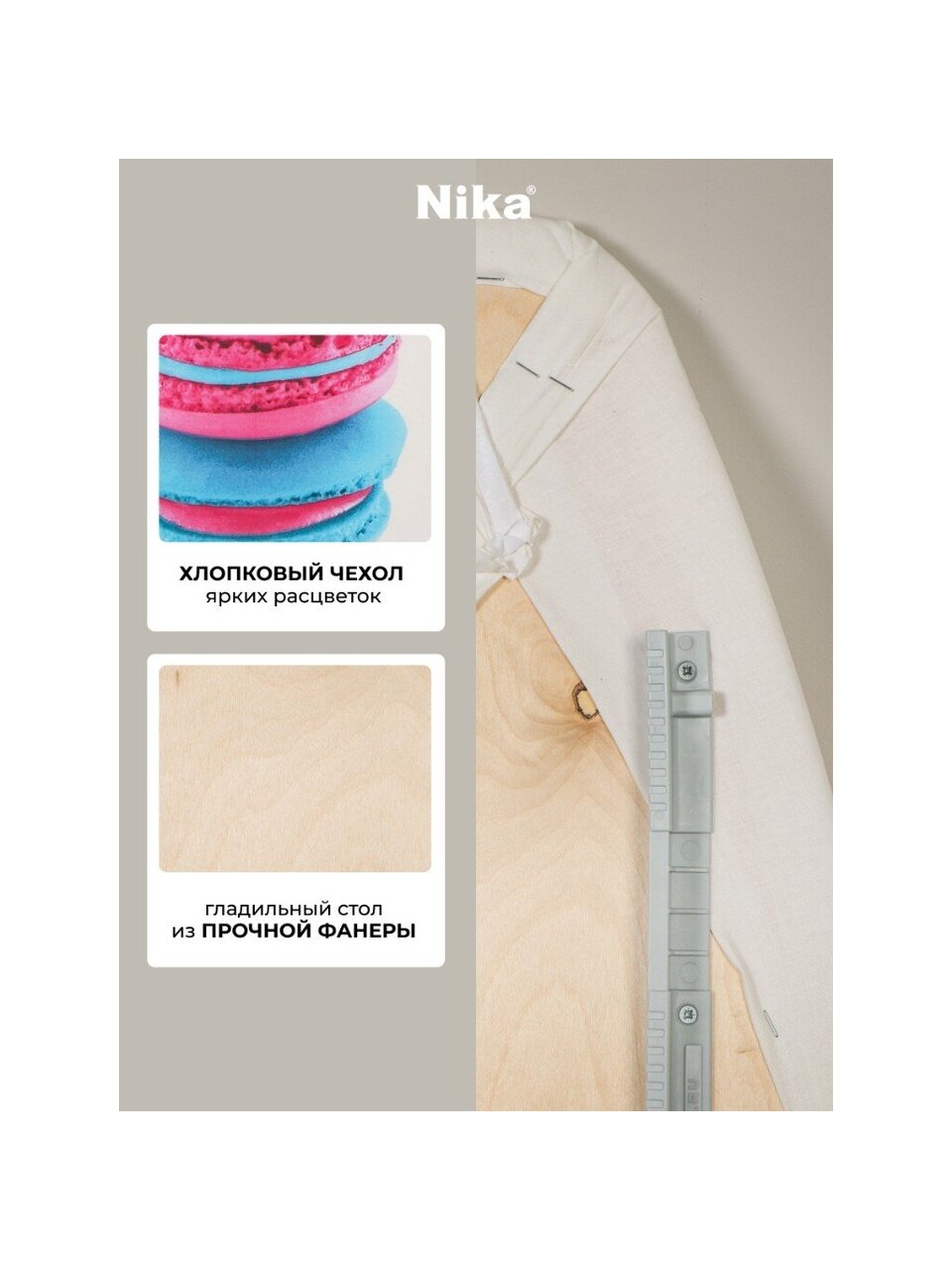 Гладильная доска Nika Н7 с рабочей поверхностью из фанеры и чехлом из хлопка – отличный вариант для ежедневного использования. Изделие оснащено подставкой под утюг, удобной полкой для белья и съёмным подрукавником.