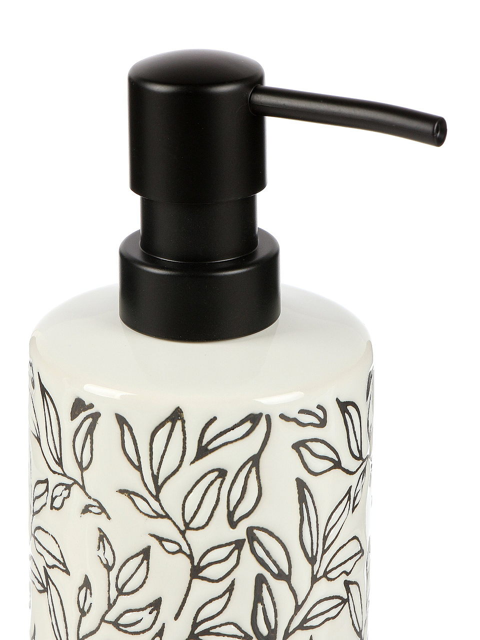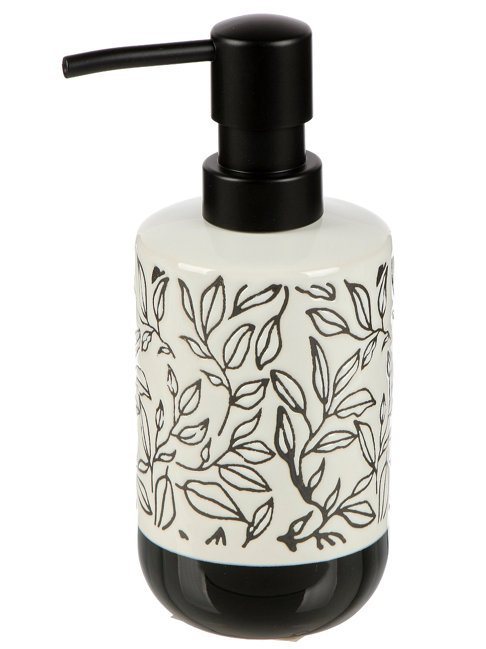 Стильный керамический дозатор для жидкого мыла: лаконичный черно-белый дизайн, компактный размер и долговечность для ванной или душа.