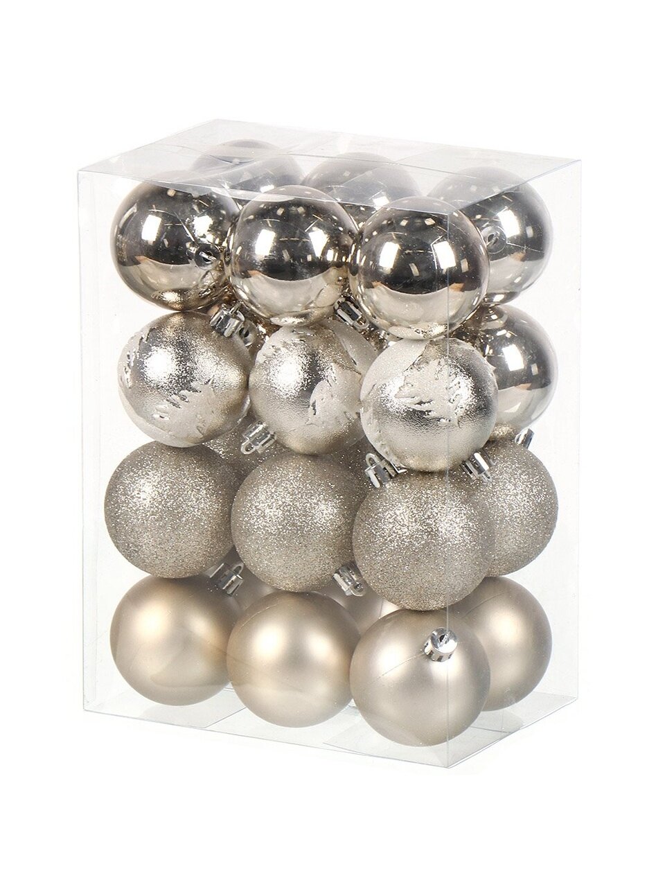 В наборе 24 шара диаметром 6 см. Все шары однотонные, с блестящим покрытием, на подвеске, упакованы в коробку.