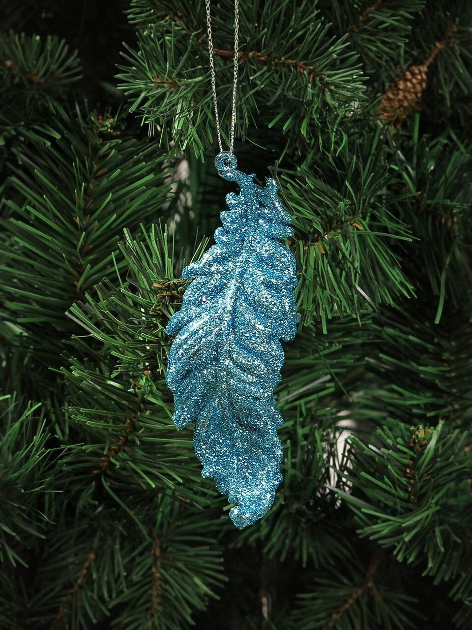 Размер каждого пера — 13.5х14 см, это крупное украшение, которое отлично смотрится на средних и больших ёлках, включая уличные композиции.