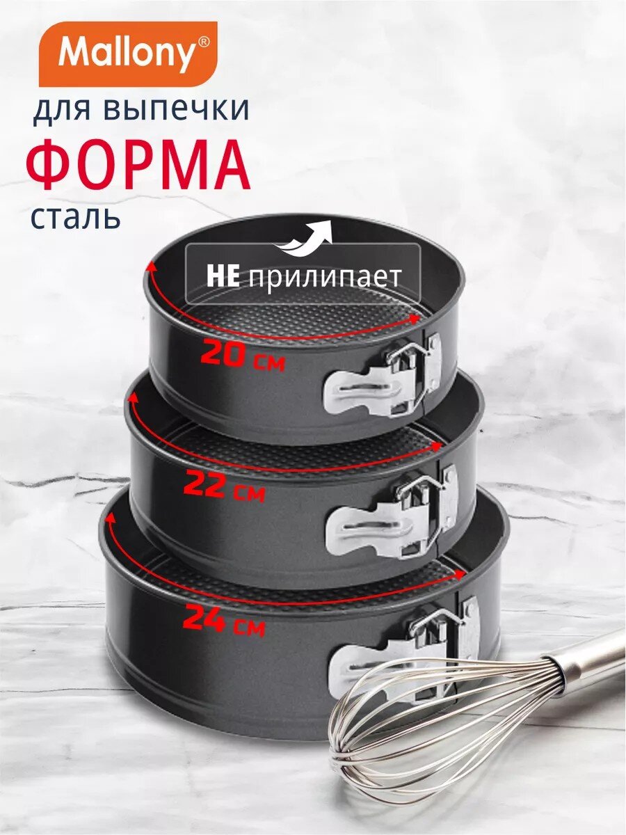 В наборе Mallony 191312 три размера: 20, 22 и 24 см. Выбирайте диаметр по объему теста или рецепту — для небольших тортов подойдет 20 см, для больших — 24 см.