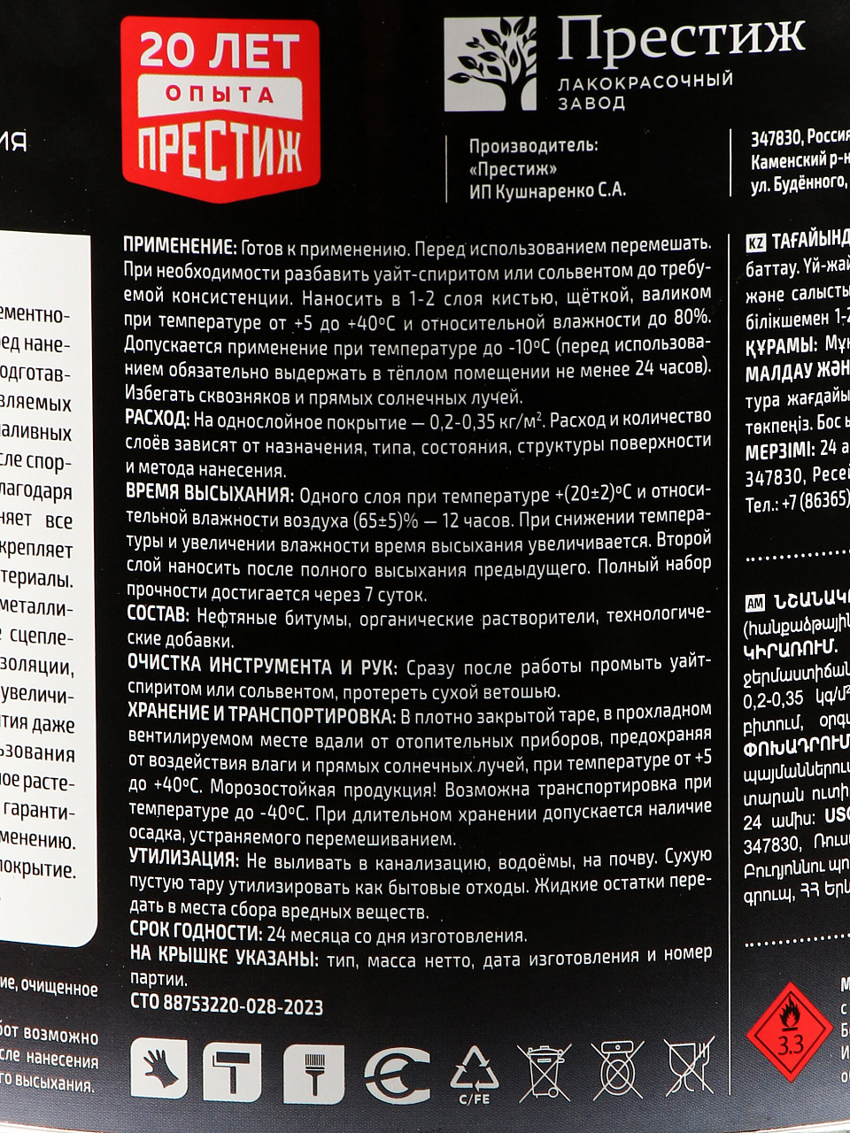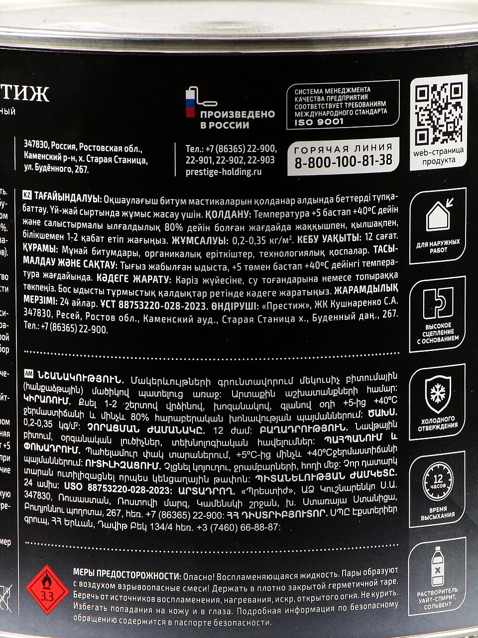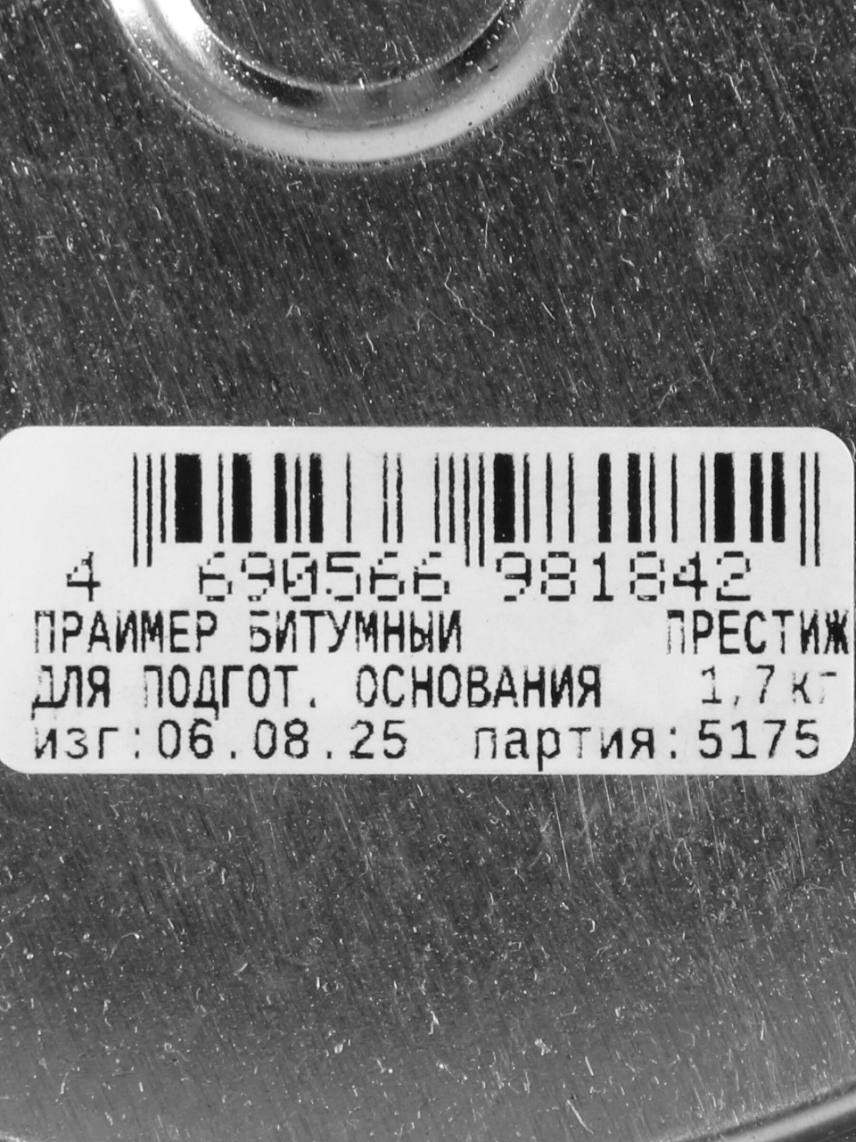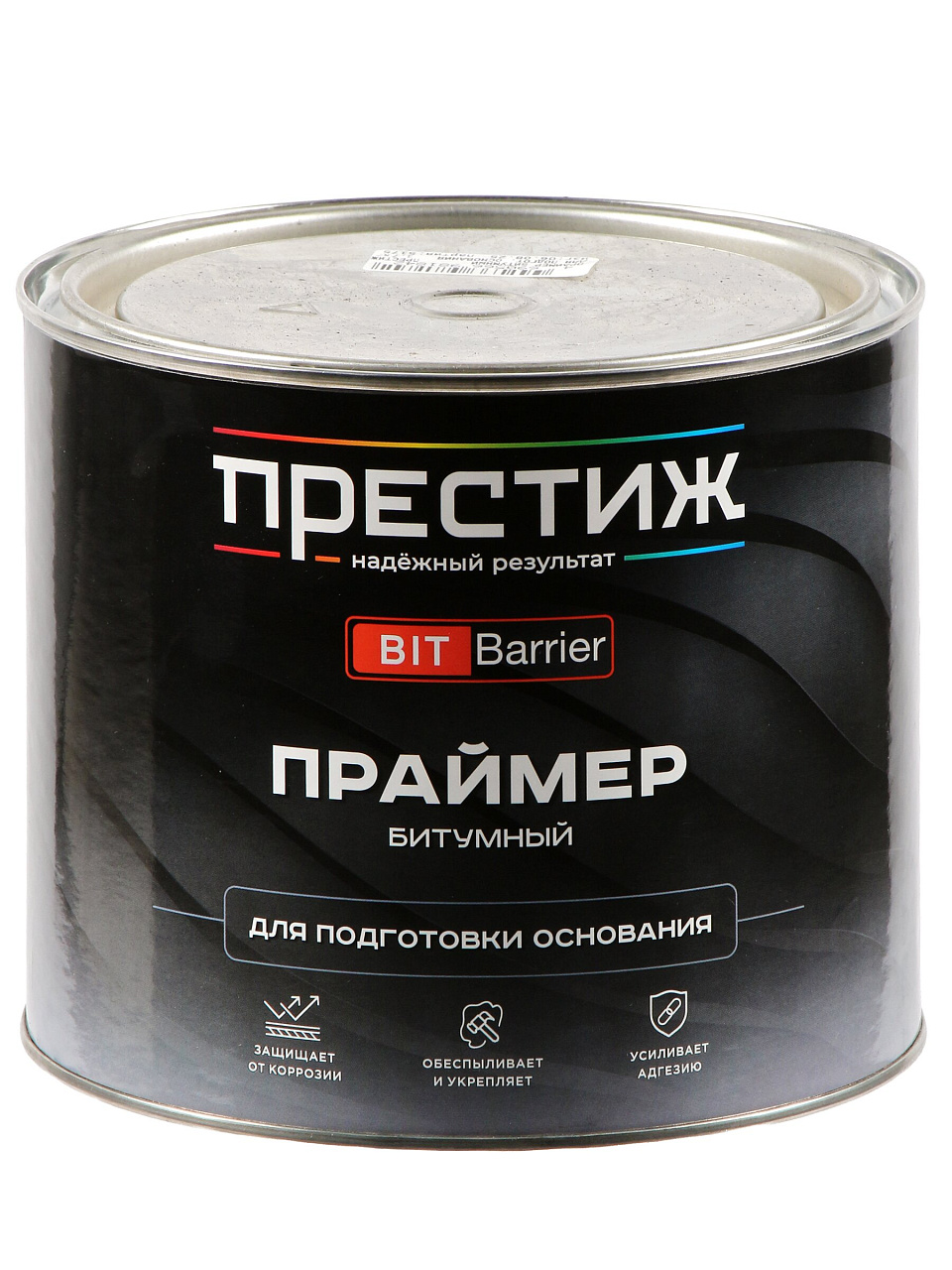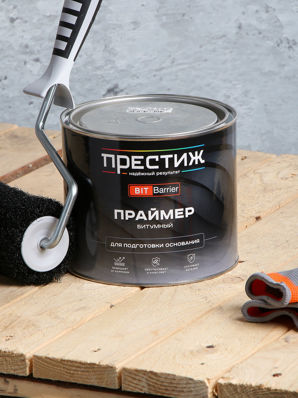 Праймер Престиж, битумный, 1.7 кг: быстрое и надежное грунтование для защиты бетона и металла от влаги — профессиональный результат уже после первого применения.