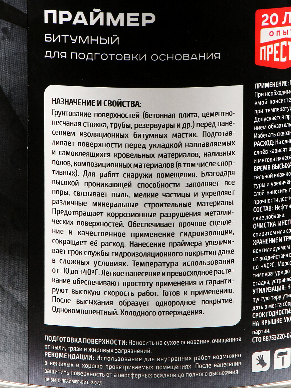 Праймер Престиж — битумный грунт для подготовки основания, который выбирают профессионалы и владельцы частных домов. Благодаря высокой проникающей способности и совместимости с бетоном, цементно-песчаными стяжками, трубами и резервуарами, он обеспечивает надежное основание для нанесения битумных мастик. Если вы ищете, какой праймер выбрать для гидроизоляции фундамента или чем обработать бетон перед изоляцией, этот продукт отвечает всем современным требованиям.