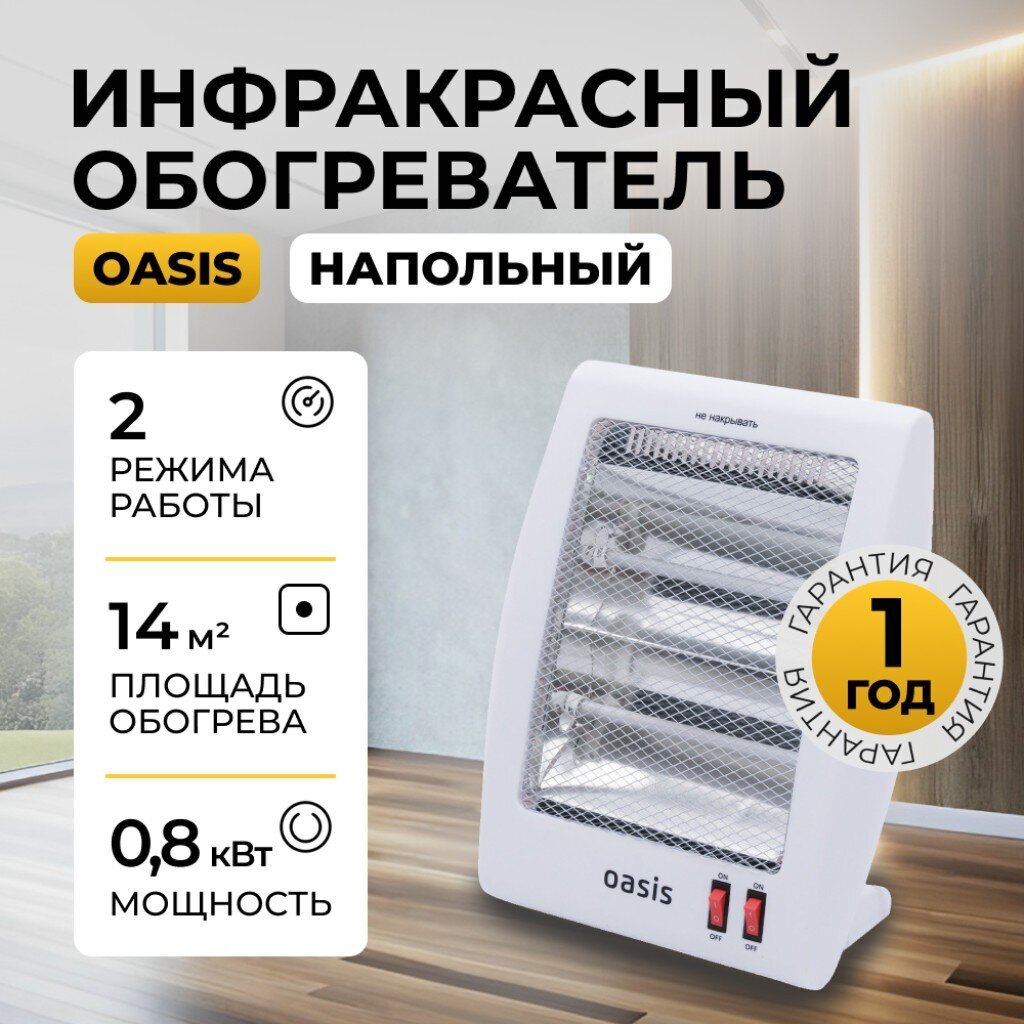 Инфракрасный обогреватель Oasis – это электронагревательный прибор с теплоотдачей преимущественно инфракрасным излучением. Предназначен для основного, дополнительного и местного обогрева бытовых и аналогичных помещений (частные дома, веранды, квартиры, офисы, склады, мастерские, павильоны, небольшие торговые точки и т.п.). Инфракрасное излучение проходит сквозь воздух и обогревает предметы, стены и пол помещения, от которых, в свою очередь, нагревается воздух.