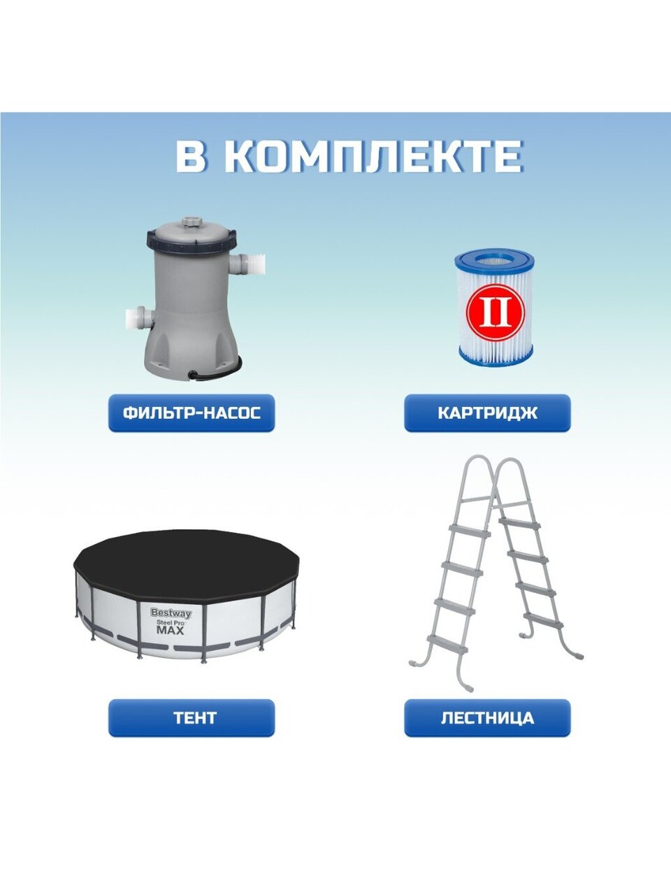 - В комплекте идет фильтр-насос с производительностью 3028 л/ч, обеспечивающий чистоту воды.