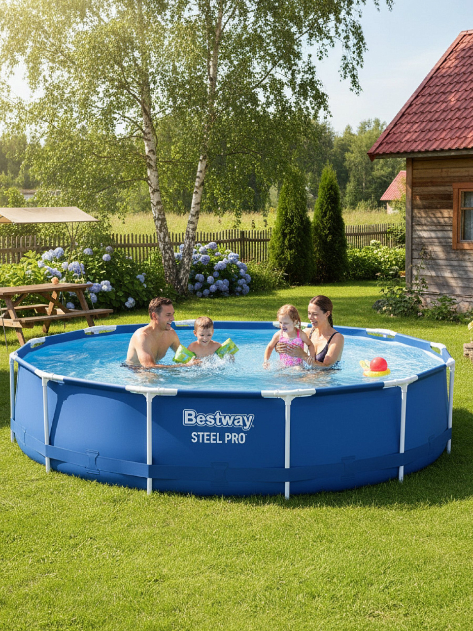 Если вы ищете, какой каркасный бассейн выбрать для дачи, обратите внимание на модель Bestway Steel Pro 56706. Круглая форма, вместимость до 6500 литров и усиленный стальной каркас обеспечивают безопасность и долговечность даже при ежедневном использовании. Трёхслойный ПВХ с армирующей лентой устойчив к проколам и УФ-лучам, а удобный сливной клапан облегчает обслуживание.
