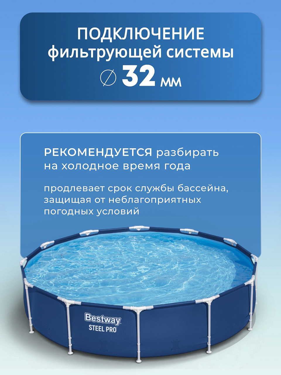 - Уникальная прочность — стальной каркас и трёхслойная чаша с ПВХ-лентой для усиления стенок