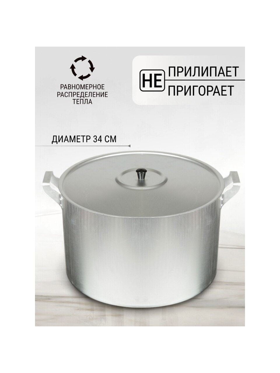 Кастрюля рассчитана на 20 литров, диаметр и дно — 34 см, высота с крышкой — 24,5 см. Отлично подходит для супов, макарон, пельменей, компотов и заготовок на зиму.