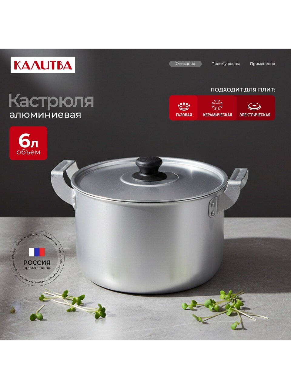 Закажите алюминиевую кастрюлю Калитва 6 л по выгодной цене — это выбор, проверенный временем. Гарантия 24 месяца, быстрая доставка и консультации эксперта по подбору объёма и типа плиты. Оформите заказ сейчас и получите надежную посуду для дома и дачи.