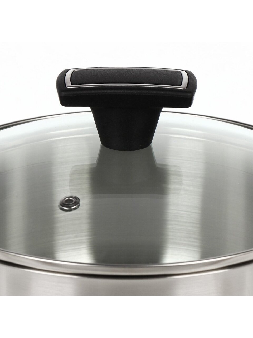 - Удобный объём 2.2 л и мерная шкала — оптимально для семьи, диаметр 18 см, сталь 201, стеклянная крышка с клапаном.