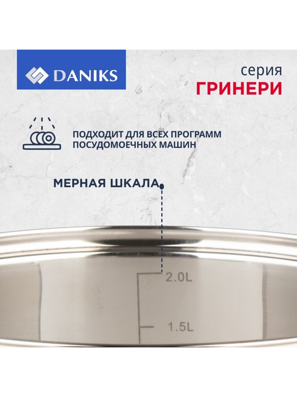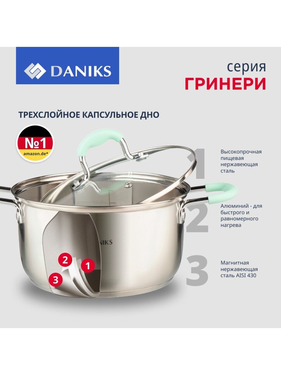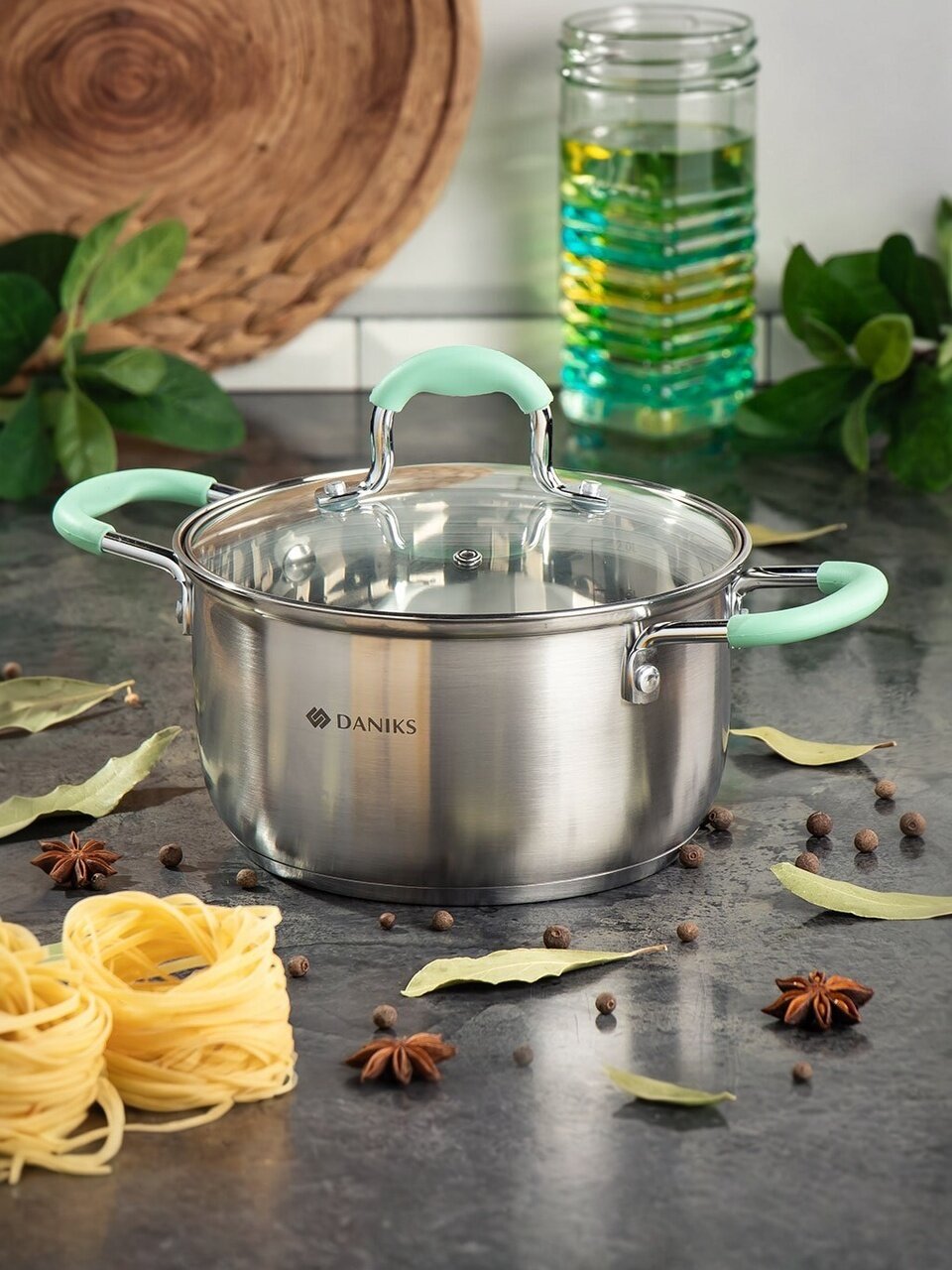Кастрюля из нержавеющей стали 2.5 л Daniks Гринери — идеальный выбор для индукции и любых плит: стиль, долговечность, комфорт силиконовых ручек.