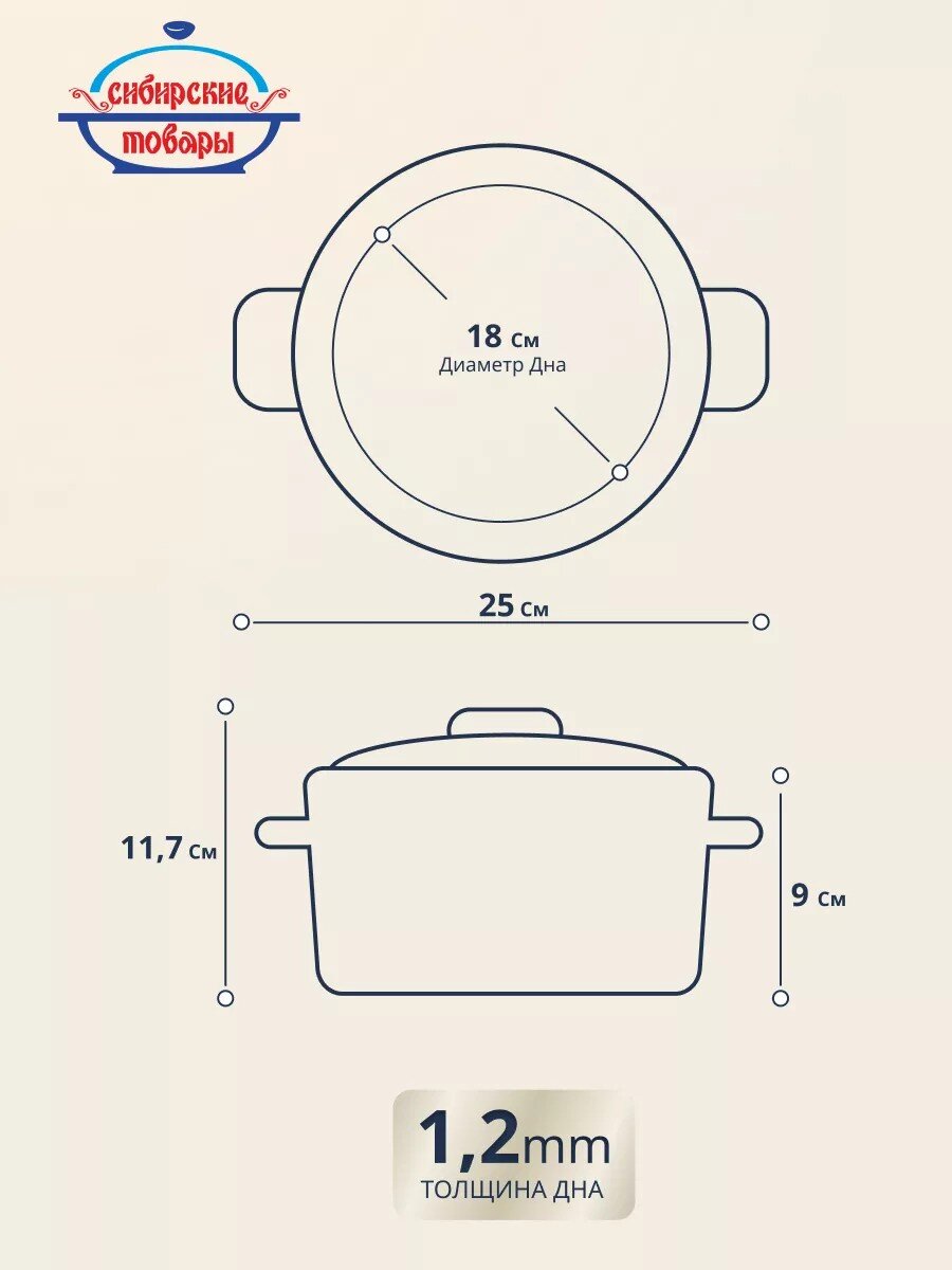Объём кастрюли — 2 литра. Подходит для приготовления супа, каши, пюре, макарон, пельменей. Оптимальный размер для семьи из 2–3 человек.