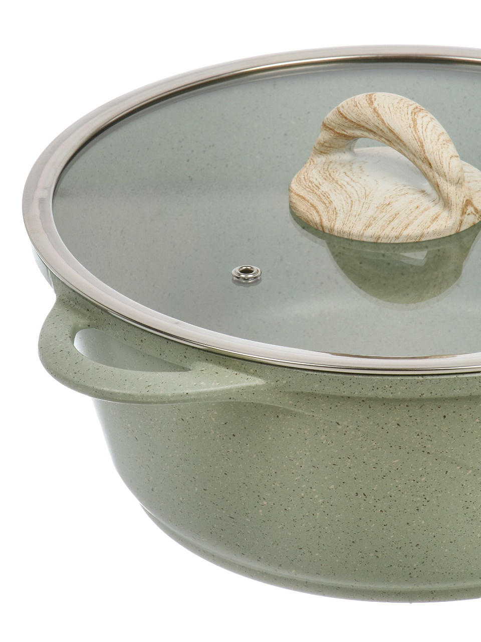 Гранитное покрытие устойчиво к царапинам и износу, не требует большого количества масла, облегчает мытьё и продлевает срок службы кастрюли.