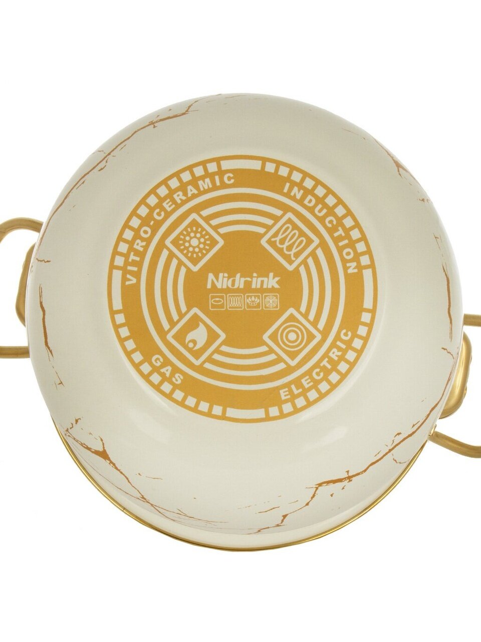 - Эстетика и универсальность: современный дизайн «Белый мрамор», совместимость с индукционными плитами и другими типами варочных поверхностей