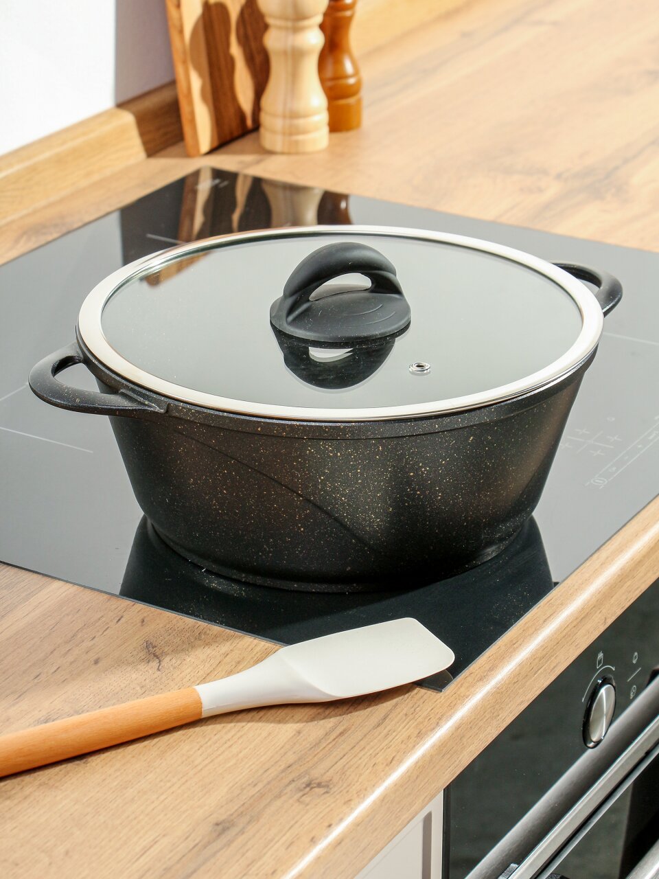 Если вы ищете, какую кастрюлю выбрать для индукционной плиты или для приготовления супа, плова, пельменей, обратите внимание на модель Eclipse бренда Гурман. Прочное алюминиевое основание с толстым дном (5,5 мм) обеспечивает быстрый и равномерный прогрев, а гранитное антипригарное покрытие препятствует пригоранию даже при минимальном количестве масла. Кастрюля подходит для всех типов плит, включая индукцию, что выгодно отличает ее от аналогов с обычным дном.