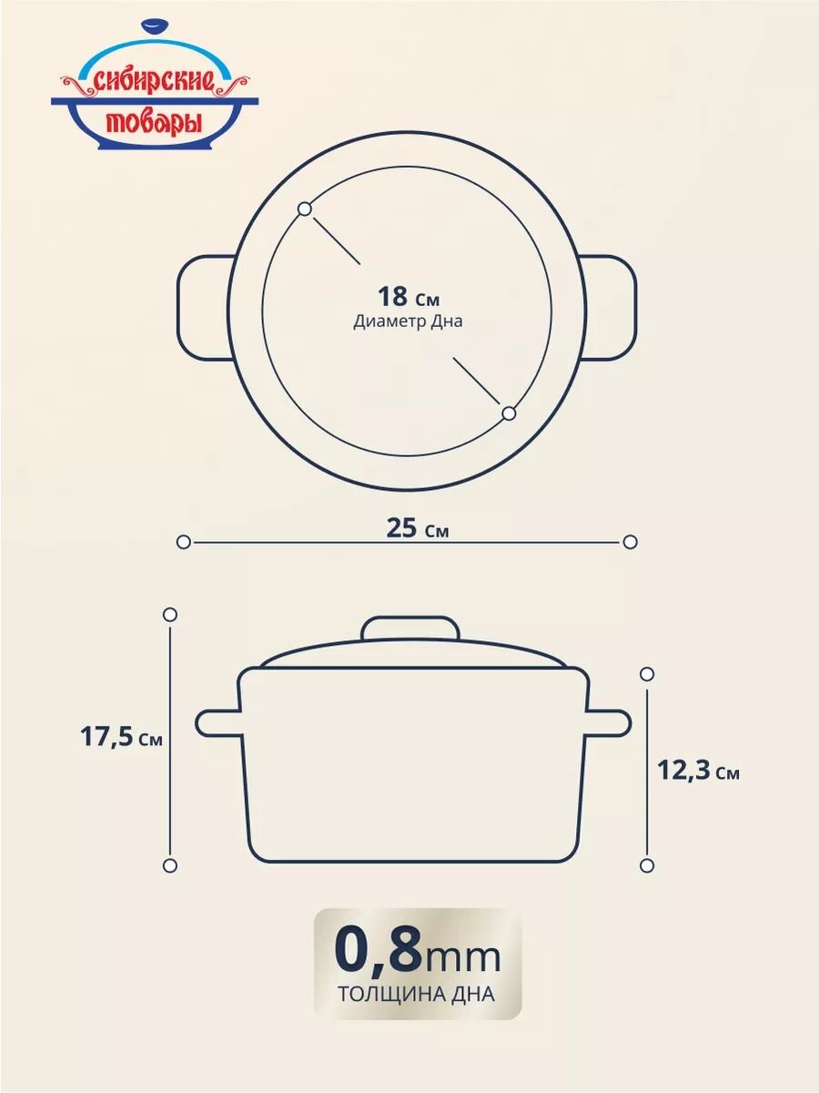 Объем — 3 литра, диаметр и дна, и крышки — 18 см, высота с крышкой — 17,5 см, без крышки — 12,3 см. Вес — 0,9 кг, толщина дна — 0,8 мм.
