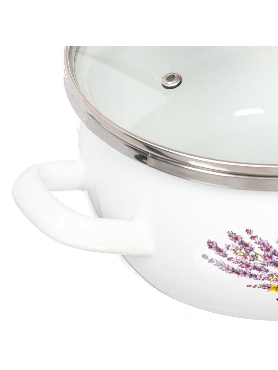 - Эмалированная сталь толщиной 0.7 мм, объём 2.5 л, подходит для всех типов плит, включая индукционные
