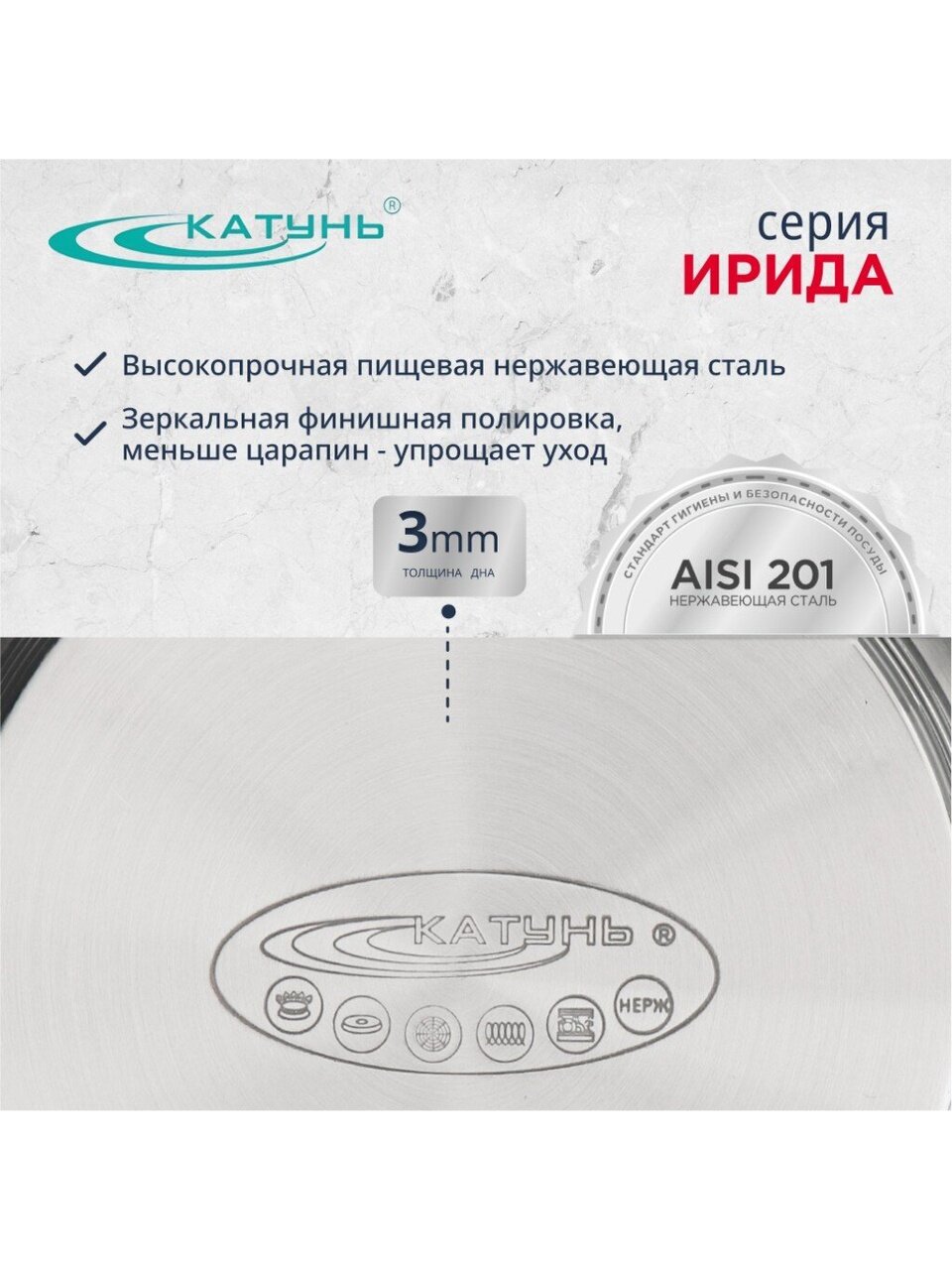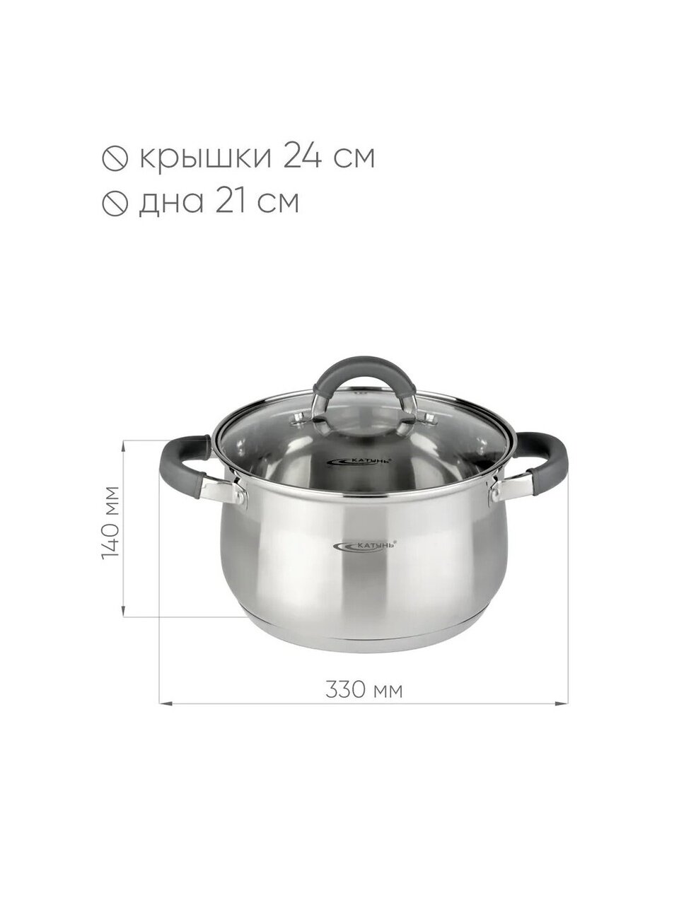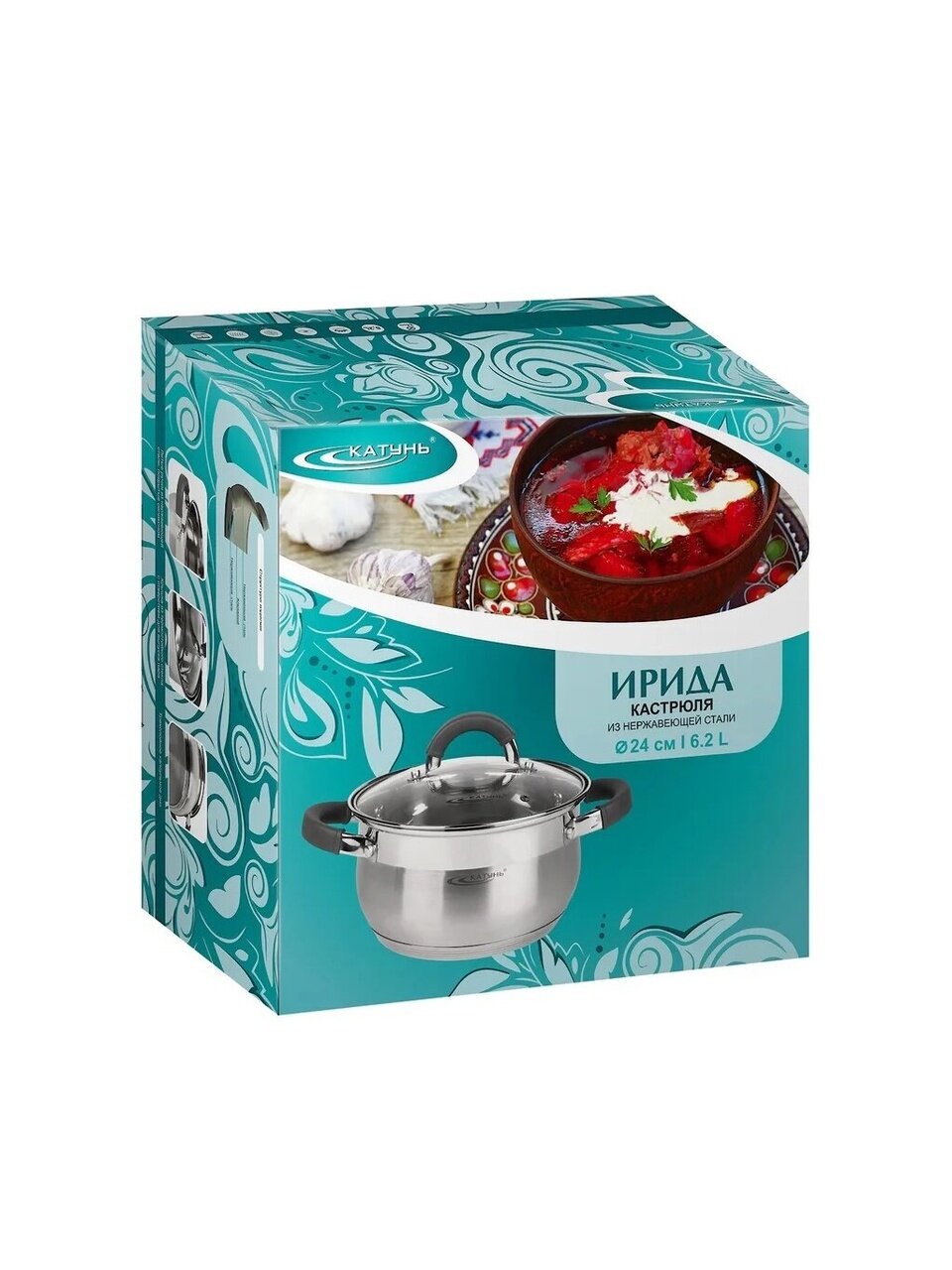 Кастрюля нержавеющая сталь, 6.2 л, крышка стекло, Катунь, Ирида, КТ08-D-24, индукция