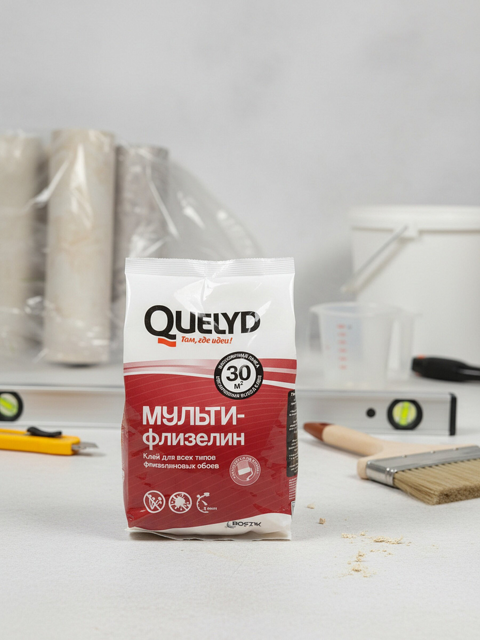 Клей для флизелиновых обоев Quelyd Мульти Флизелин 200 г — профессиональный результат без потёков и пузырей: идеально подходит для ремонта своими руками, быстро схватывается, экономит время и деньги.
