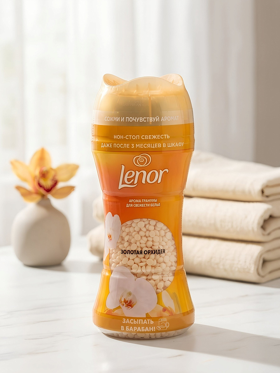 Парфюмированные гранулы Lenor Symphony «Золотая орхидея» — это инновационное решение для тех, кто ищет способ продлить ощущение свежести после стирки. В отличие от стандартных жидких кондиционеров, гранулы не содержат смягчающих компонентов, что делает их идеальным дополнением к любому стиральному порошку или гелю, не влияя на впитывающие свойства полотенец или спортивной одежды. Многие пользователи спрашивают, как использовать гранулы: достаточно просто насыпать нужное количество в пустой барабан перед загрузкой белья.