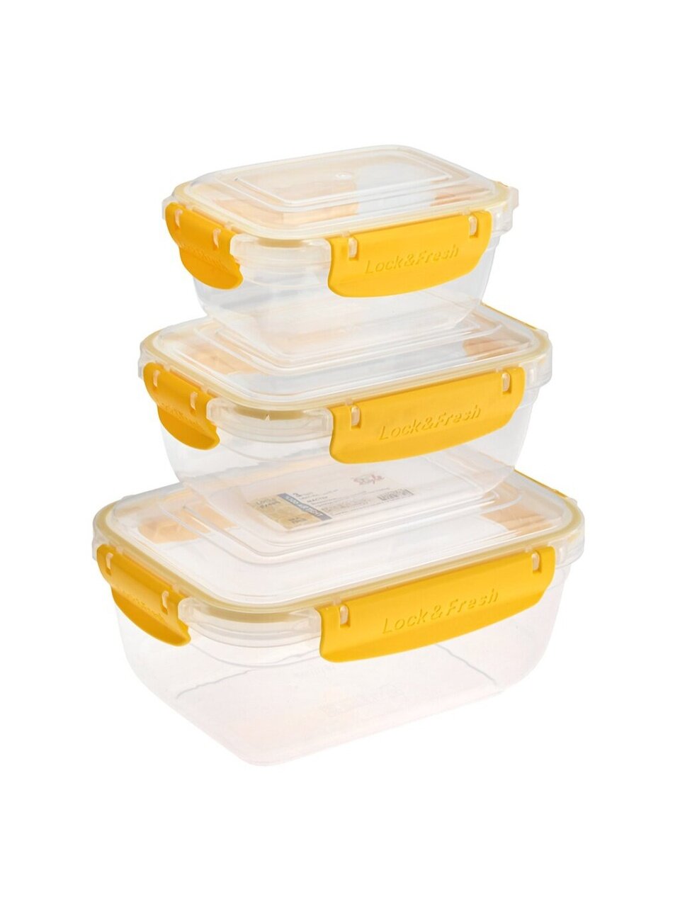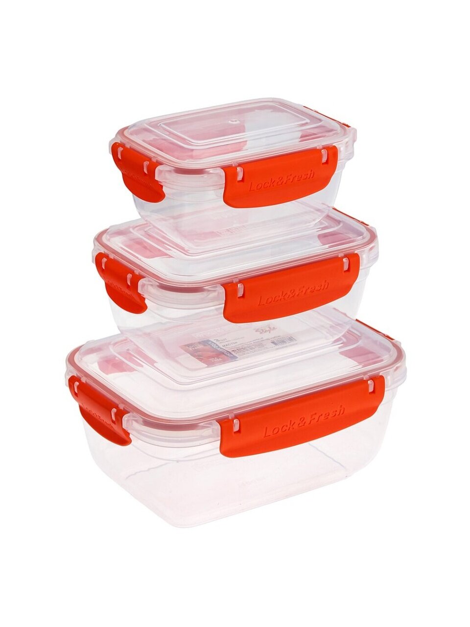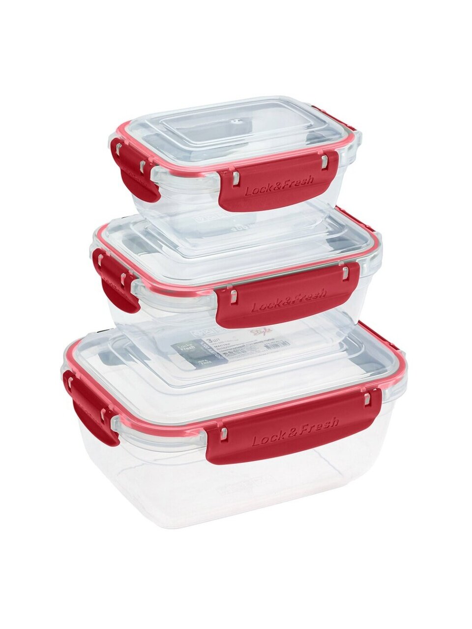 В комплекте три контейнера: 0.4 л, 0.8 л и 1.4 л. Все они прямоугольной формы, с герметичными крышками и защёлками. Цвет — в ассортименте.