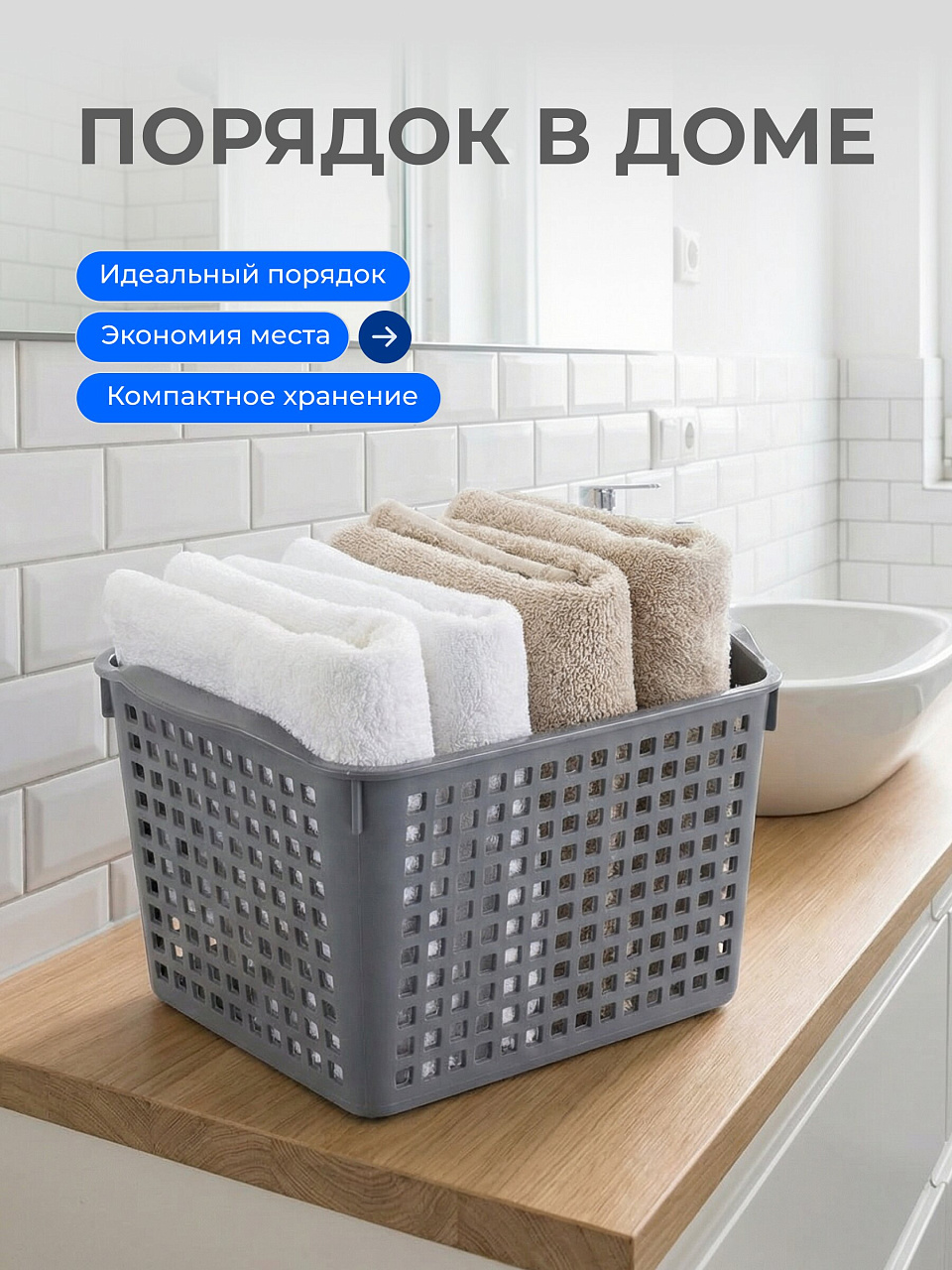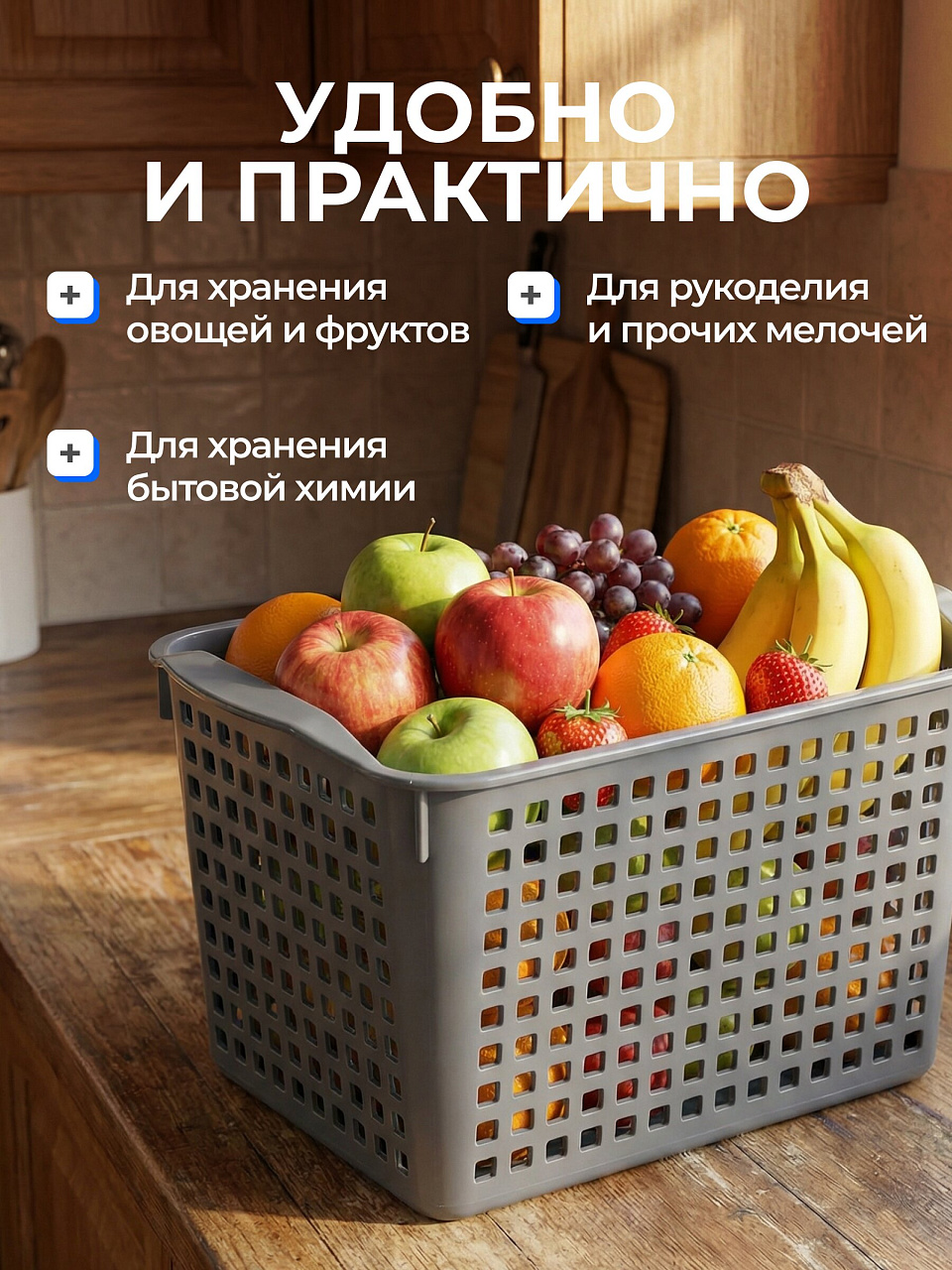 Емкость из пищевого пластика для хранения и переноски мелких аксессуаров и продуктов питания. Оптимальна для косметики и средств личной гигиены, продуктов питания и медикаментов, канцелярских товаров, товаров для творчества и многого другого. С ручками обтекаемой формы корзину удобно перемещать. Перфорация на корпусе универсальна для самых разнообразных стилей интерьера и делает изделия данной серии легкими и проветриваемыми.