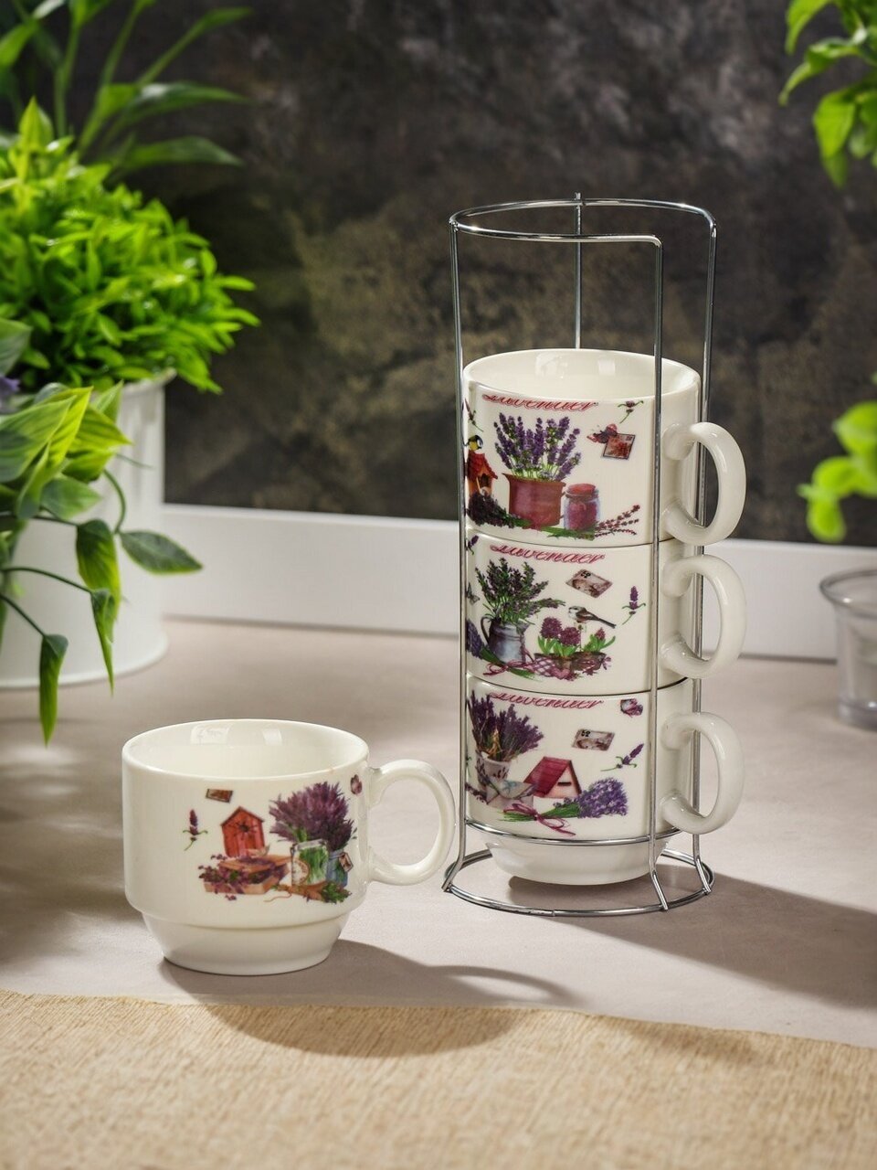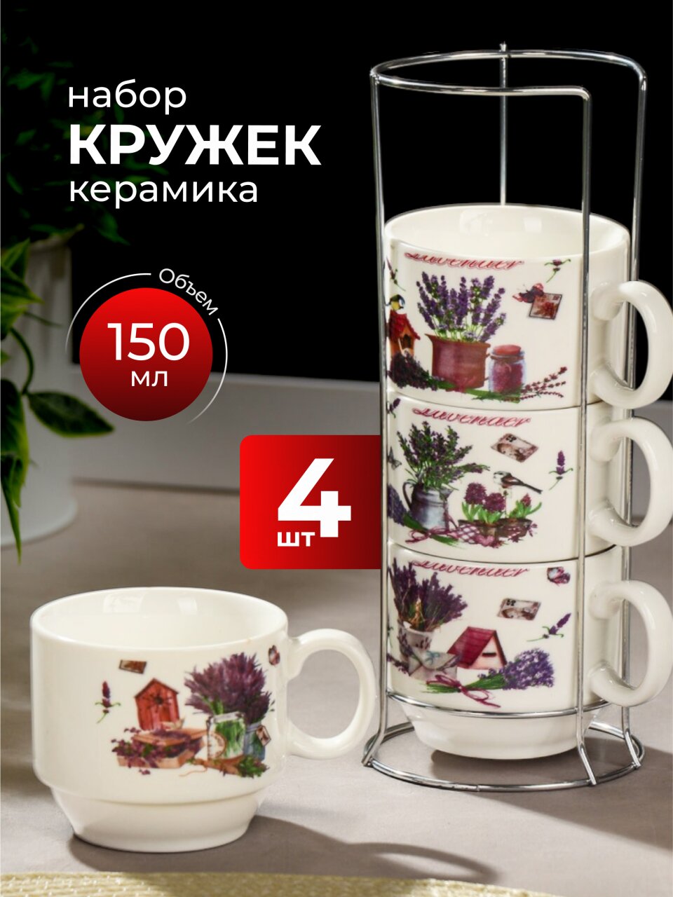 Набор керамических кружек «Лаванда лайф» 4×150 мл с металлической подставкой — уют для дома и стильный подарок в одном, подходит для чая, кофе, горячего шоколада.