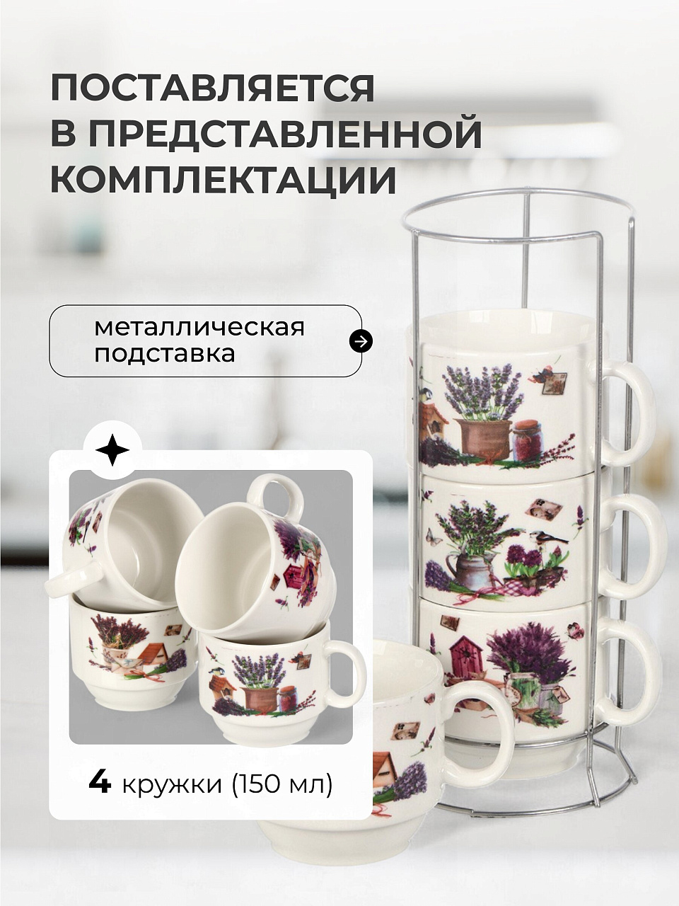 Вы можете приобрести «Кружка керамика, 4 шт, 150 мл, Лаванда лайф, Y4-6653, металлическая подставка» и другие товары в нашем интернет-магазине в Обнинске по низким ценам и с бесплатным самовывозом.