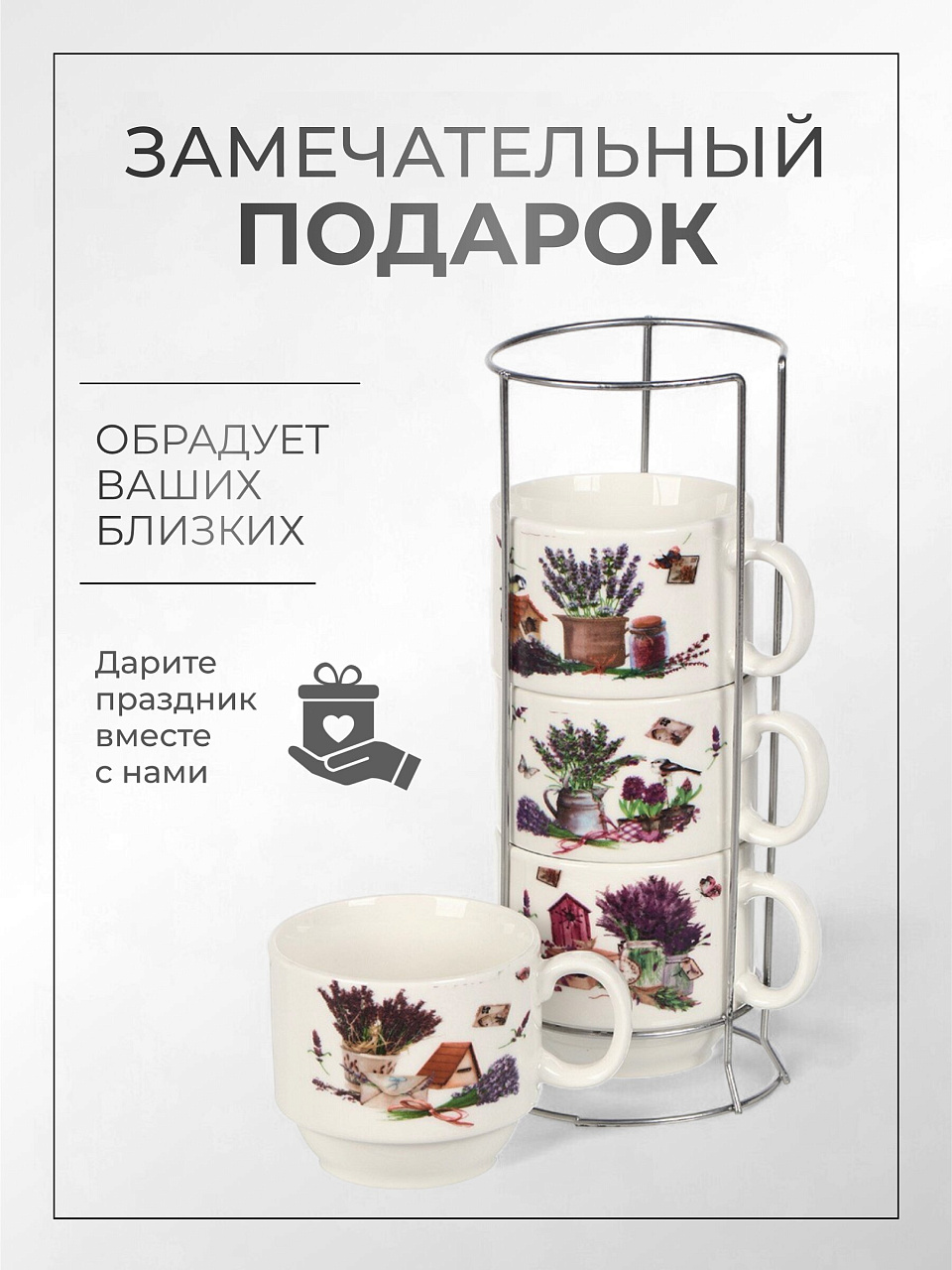 Как выбрать кружки для дома или дачи? Если вы ищете недорогой, но стильный набор кружек для чая или кофе, обратите внимание на коллекцию «Лаванда лайф». Керамика без эмали долговечна и не впитывает запахи, а объём 150 мл оптимален для порционного напитка. Металлическая подставка экономит место на кухне и упрощает хранение — удобно для небольших пространств и частых гостей.