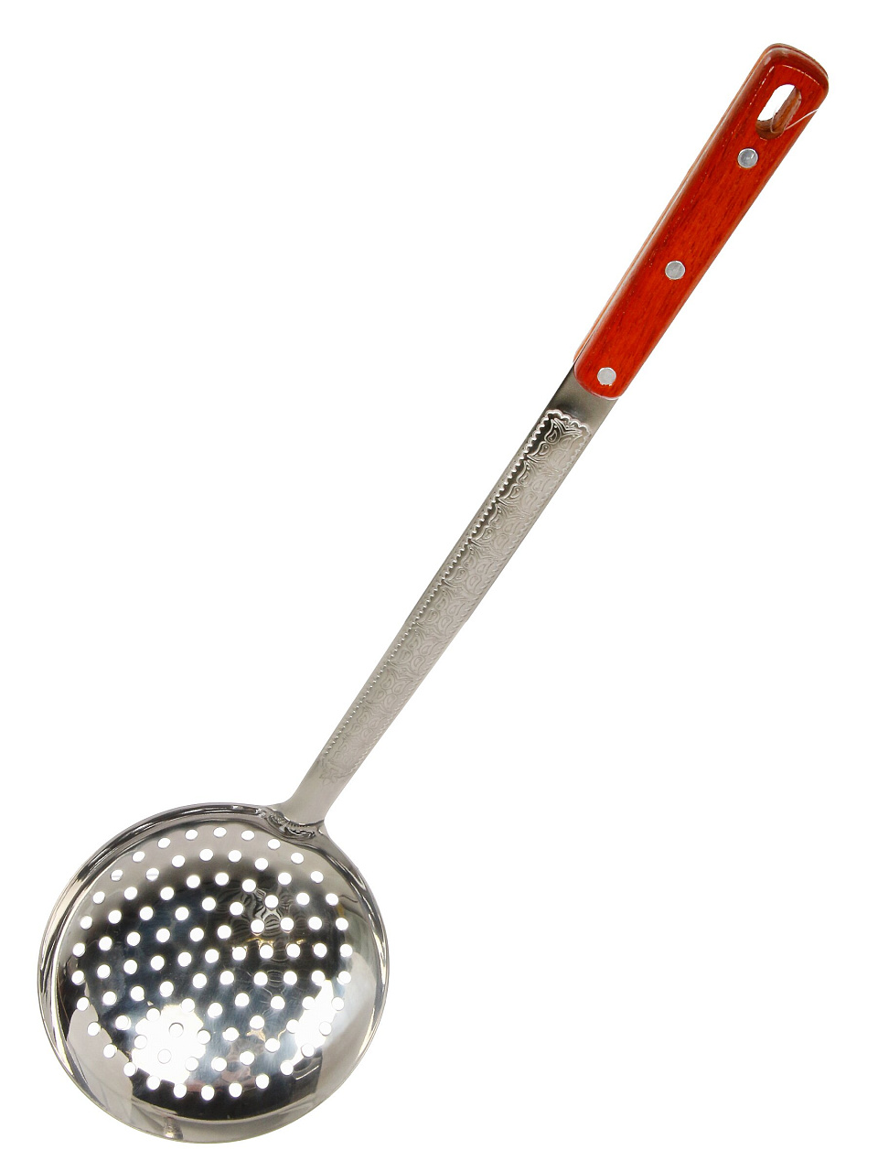 Шумовка изготовлена из пищевой нержавеющей стали марки Y4-11189, ручка — из массива дерева с защитной пропиткой от влаги.