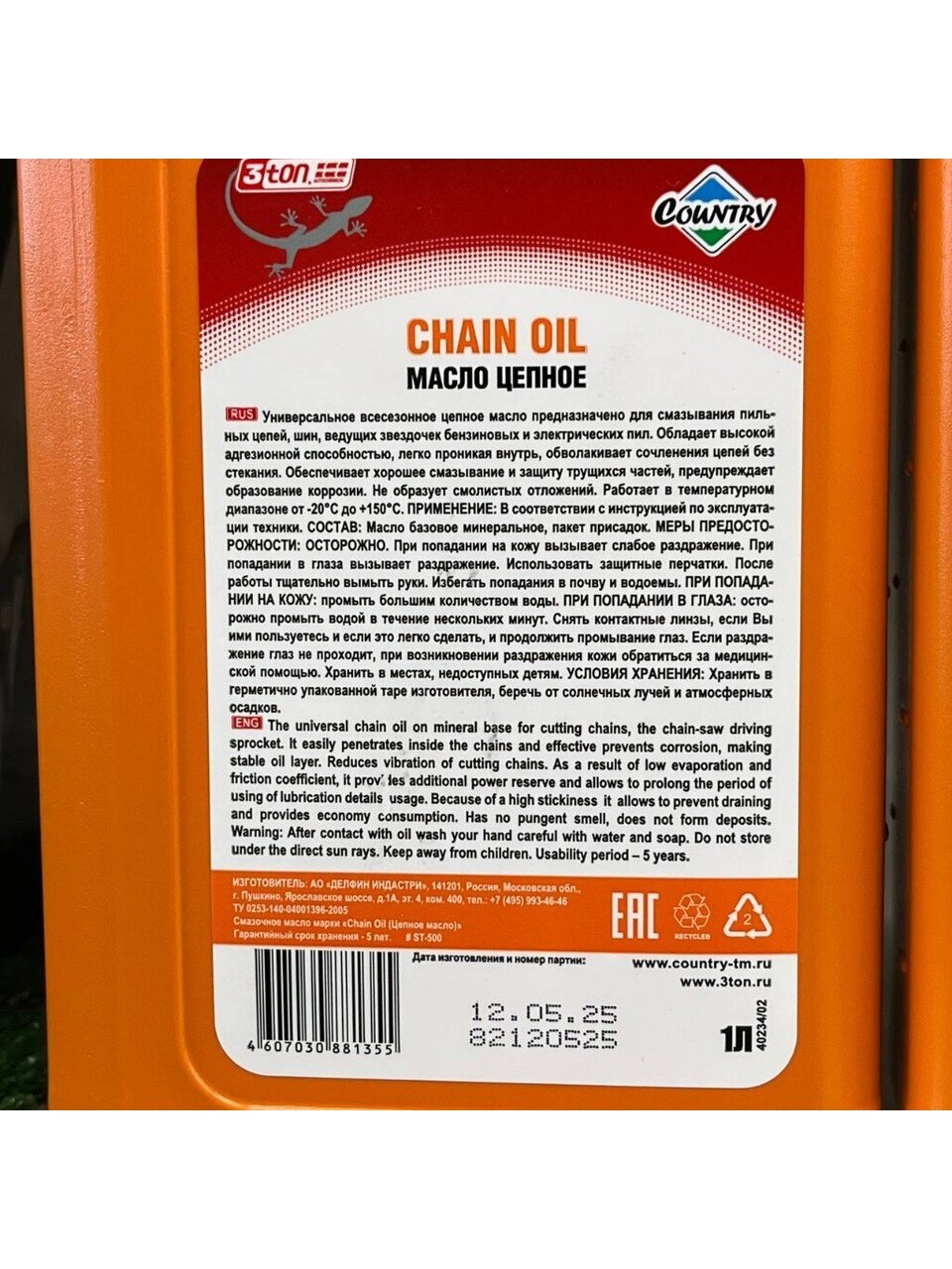 Масло цепное Country - масло на минеральной основе предназначено для смазывания пильных цепей, шин и ведущей звездочки. Содержит комплекс специальных присадок, придающих маслу уникальные свойства.