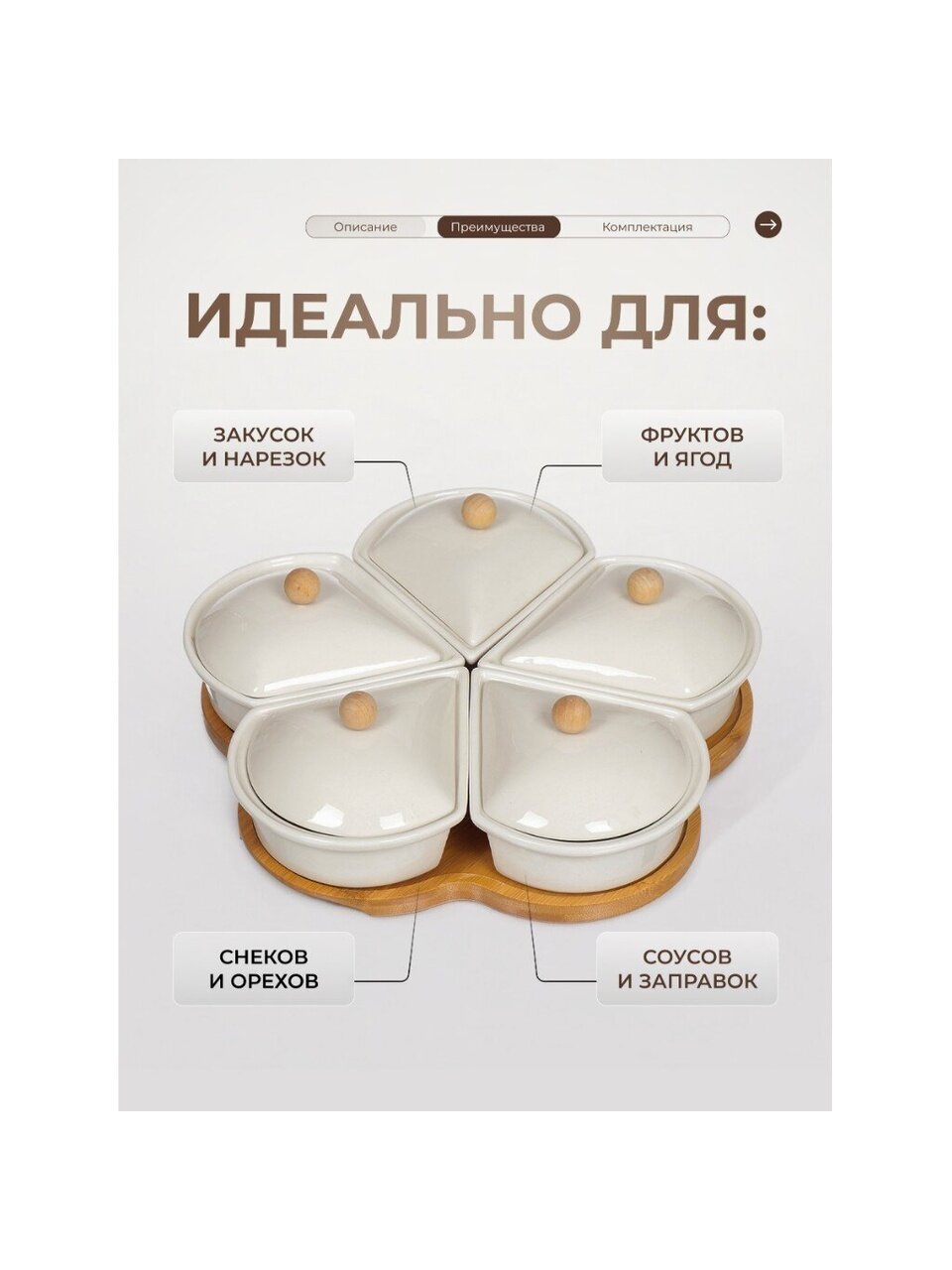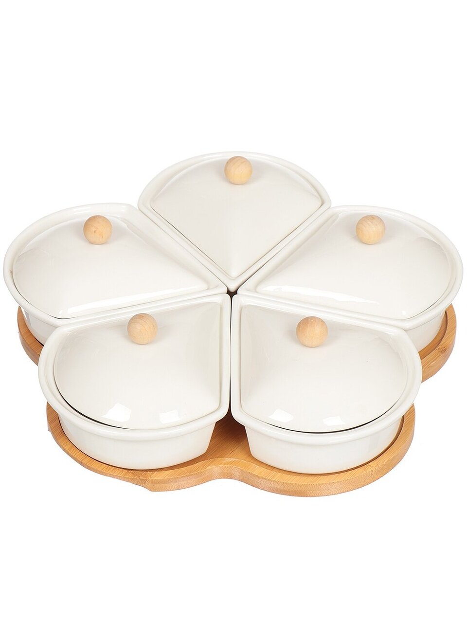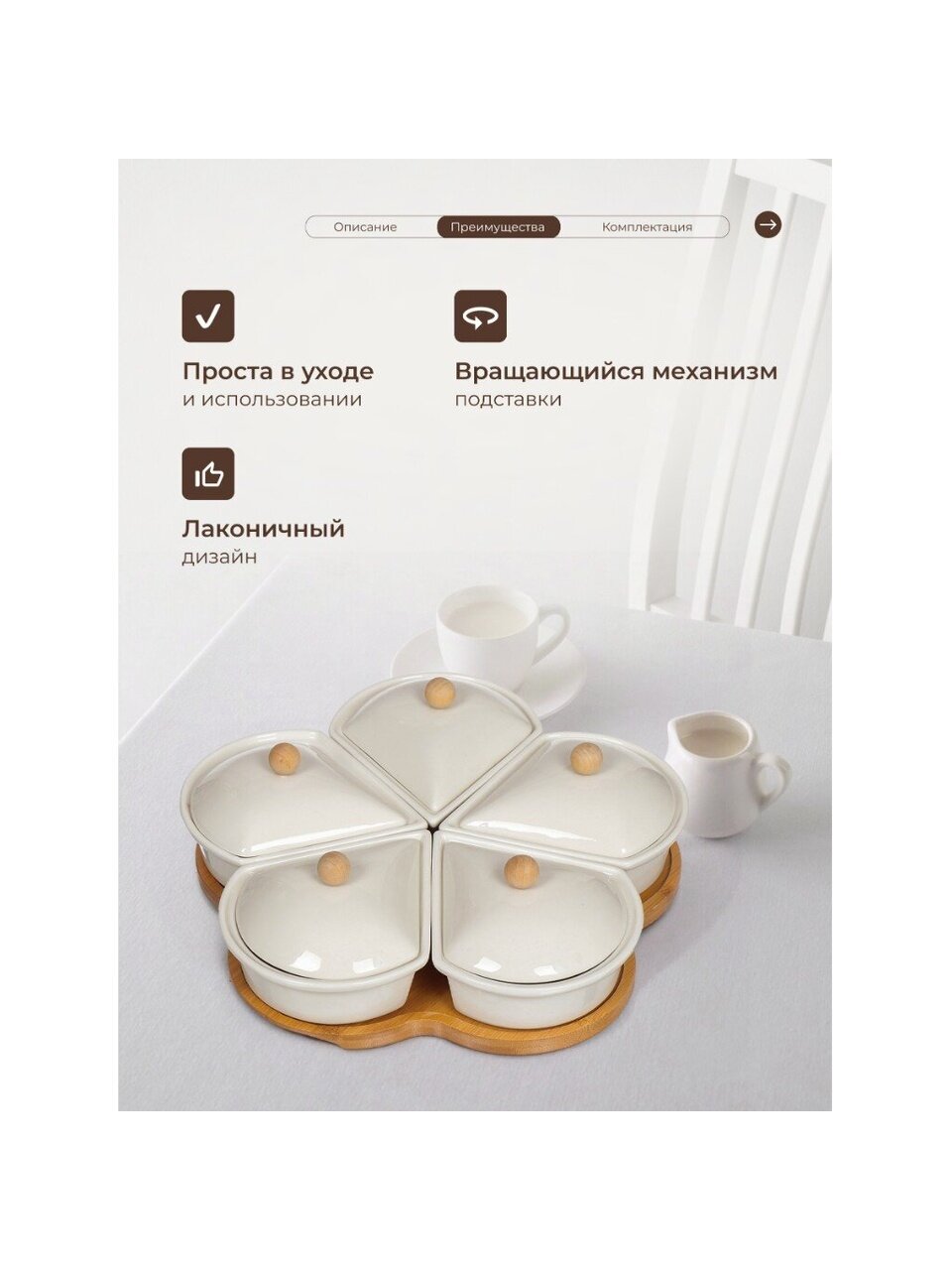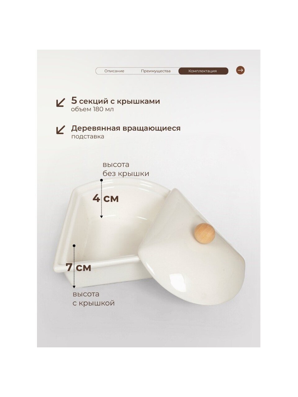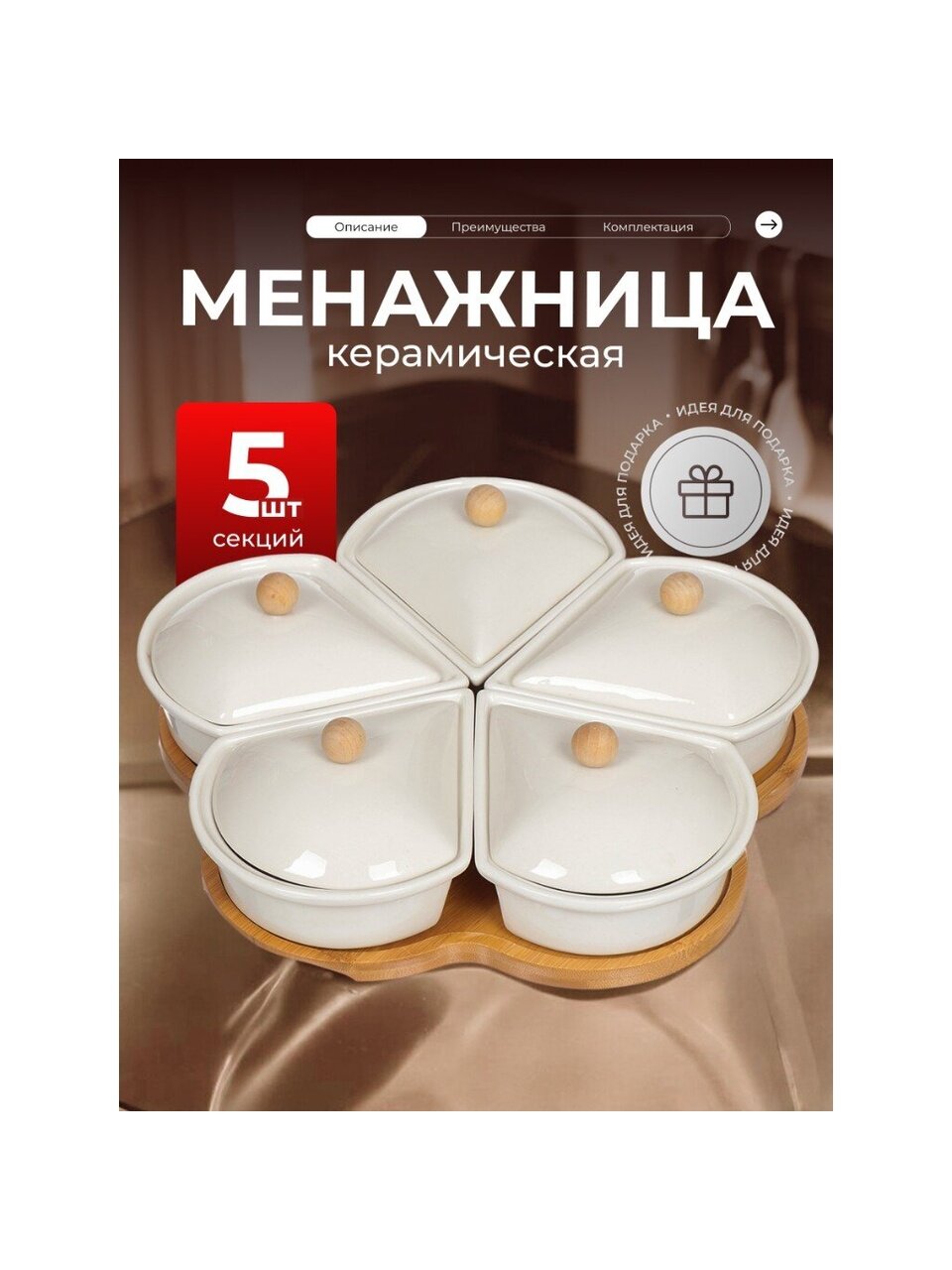 Менажница понадобится для хранения сразу нескольких блюд и для подачи на стол. Выполнена в виде нескольких декоративных емкостей с крышками, расположенные на деревянной подставке. С помощью такой менажницы можно подать на стол сразу несколько блюд в разных тарелках, но в пределах одной посуды, при этом не смешивая их между собой. Такая замысловатая вещь идеально подходит для сервировки определенных блюд, например: варенья, снеков или соусов, салатов, заправок и вторых блюд, рыбу со всякими соусами и прочие закуски. Подставка оснащена вращающимся механизмом.