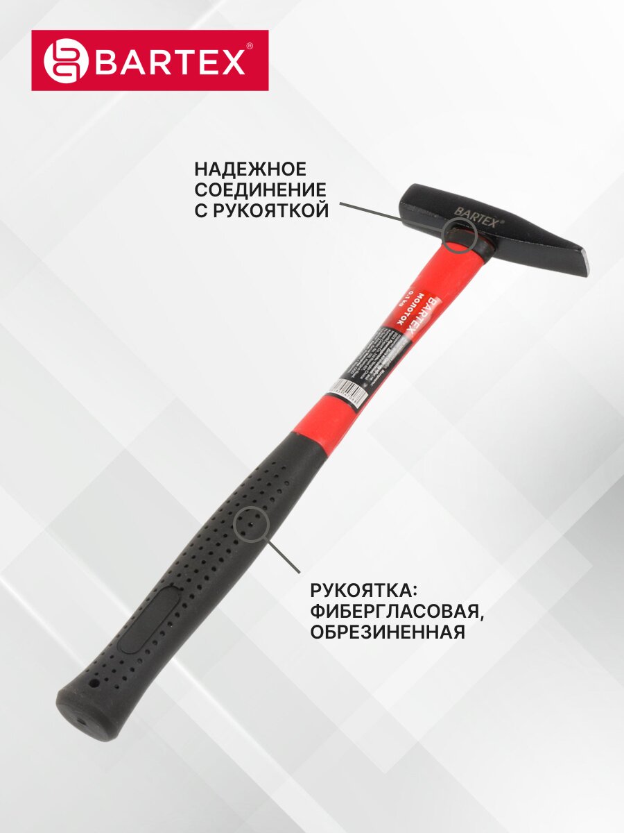 Молоток — один из самых распространенных ударных инструментов. Боек молотка Bartex B00008 выкован, отфрезерован, покрыт черным лаком и надежно зафиксирован на рукоятке. Селективная закалка обеспечивает рабочей части молотка необходимую прочность и препятствует образованию расклепов на ее гранях. Фиберглассовая рукоятка отличается высокой устойчивостью к нагрузкам и способствует эффективной амортизации удара.
