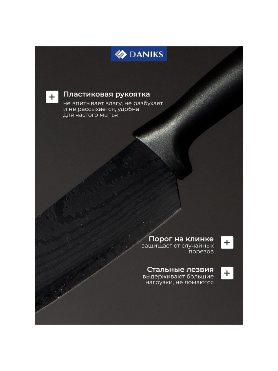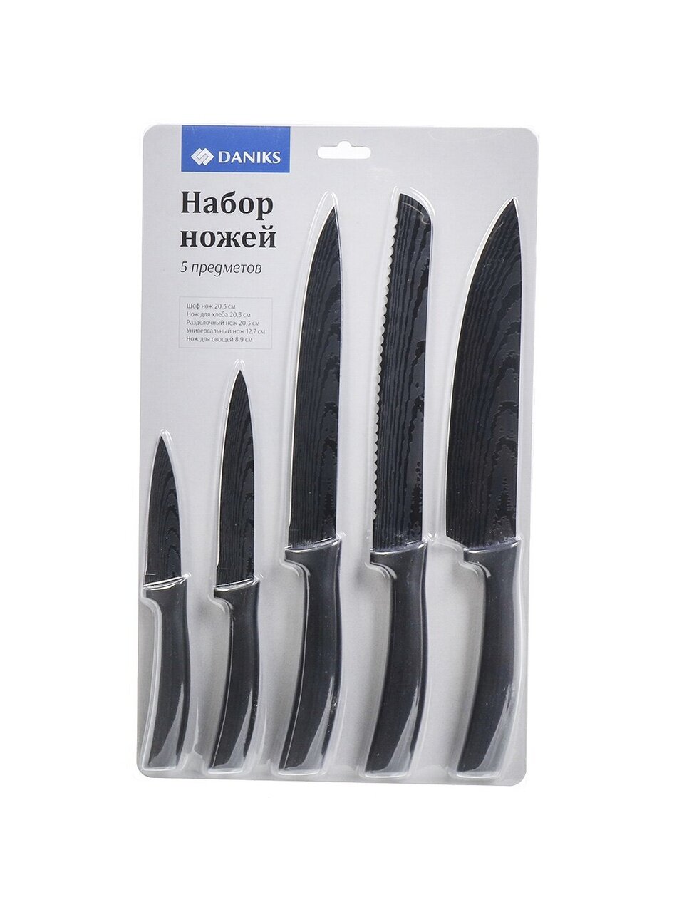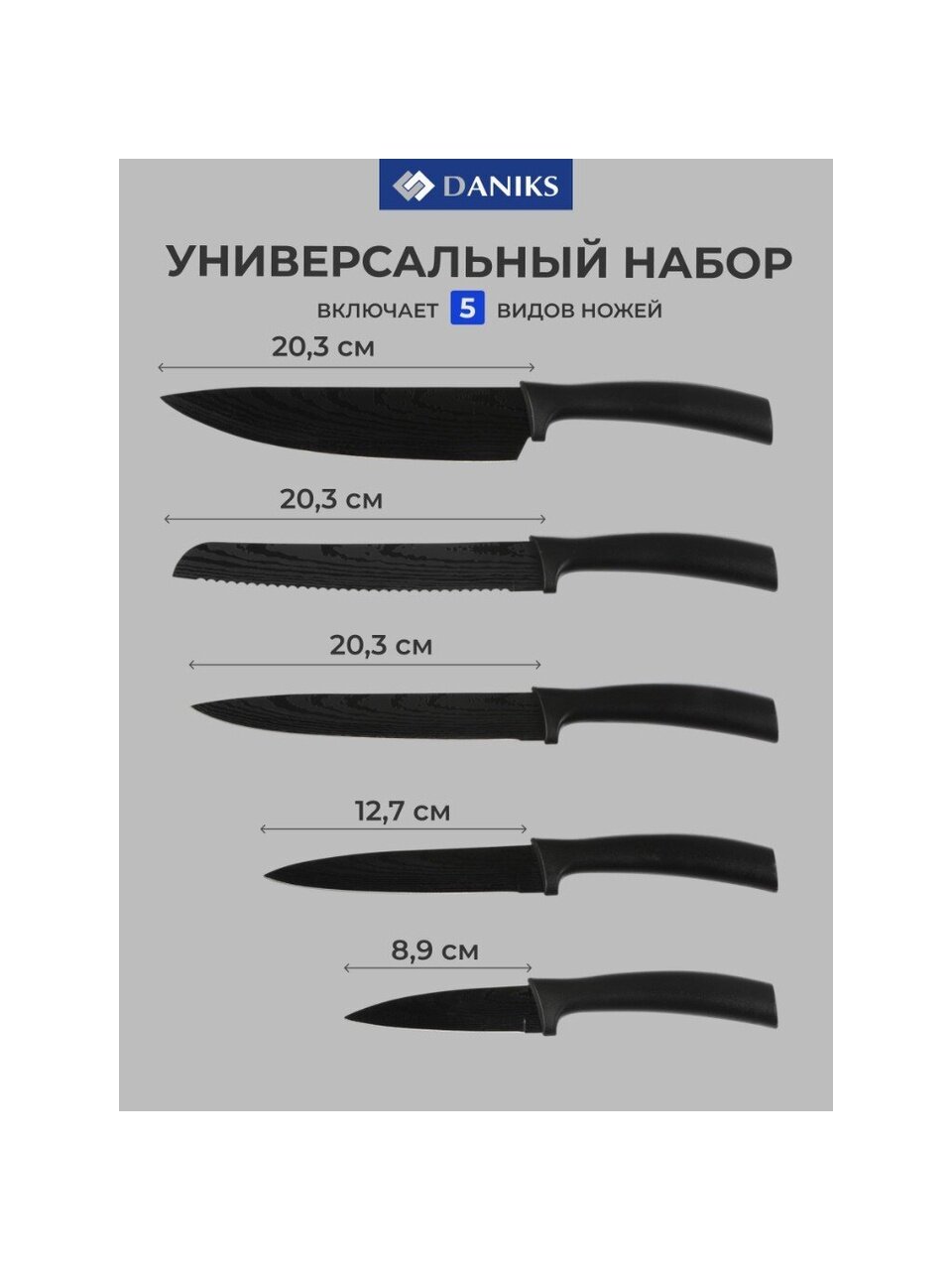 Набор ножей 5 предметов Daniks Gusta Y4-8916 – идеальное решение для современной кухни, сочетающее в себе высокое качество, стильный дизайн и практичность. Эффективная помощь в ежедневной готовке, когда нужно быстро и аккуратно нарезать продукты, не теряя времени на поиски подходящего инструмента. Универсальный комплект, включающий шеф-нож, нож для овощей, универсальный нож, хлебный нож и разделочный нож, подойдёт для любых кулинарных задач. Эргономичная рукоятка из прочного пластика обеспечивает комфорт и безопасность в использовании, а лезвия из нержавеющей стали гарантируют долговечность и остроту на долгое время. Компактная упаковка на блистере делает хранение и транспортировку максимально удобными.