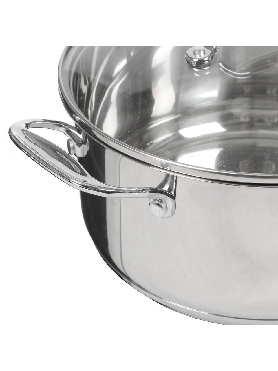 В комплекте три кастрюли объёмом 2.2, 3.2 и 4.2 литра, каждая с отдельной стеклянной крышкой. Это позволяет готовить как небольшие порции, так и блюда для всей семьи.