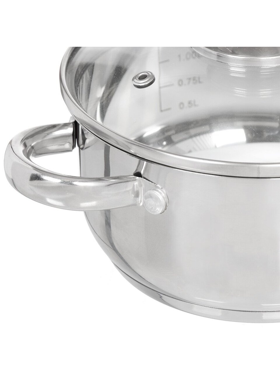 В наборе три кастрюли: 1.5 литра, 3.1 литра и 5.4 литра. Все крышки — из закалённого стекла, ручки — из стали, что обеспечивает долговечность и безопасность.