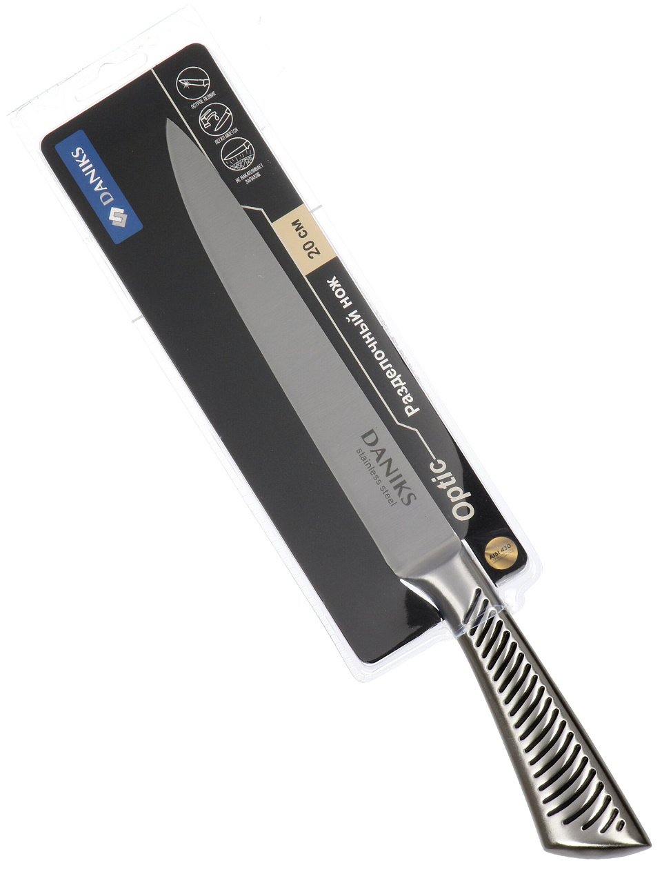 Daniks Optic с лезвием 20 см и двусторонней заточкой оптимален для мяса, рыбы, овощей. Стальная рукоятка обеспечивает надежный захват, а нержавеющая сталь устойчива к коррозии.