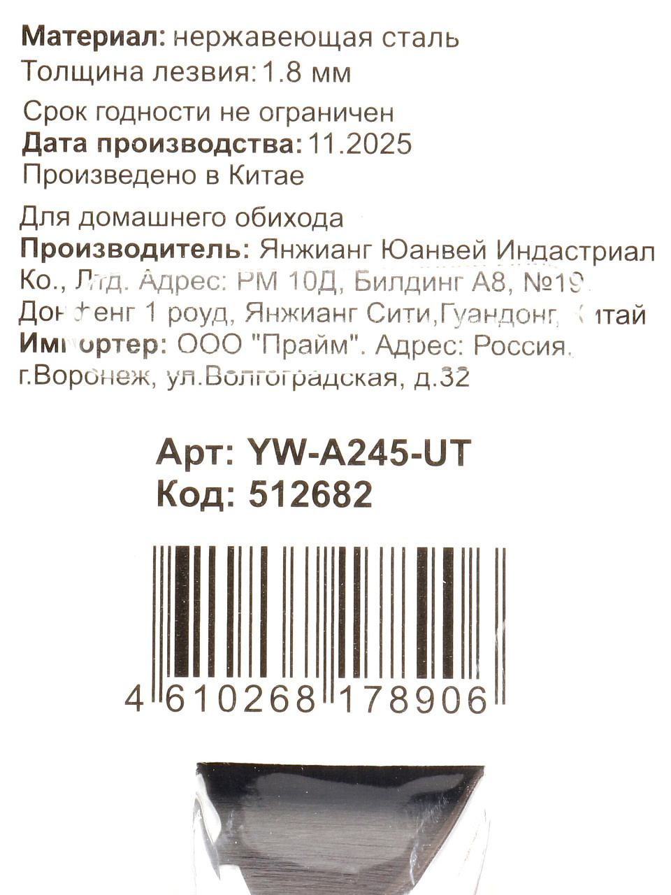 Длина лезвия — 12.5 см. Это универсальный размер для нарезки овощей, фруктов, мяса, хлеба и других продуктов, оптимален для повседневной кухни.