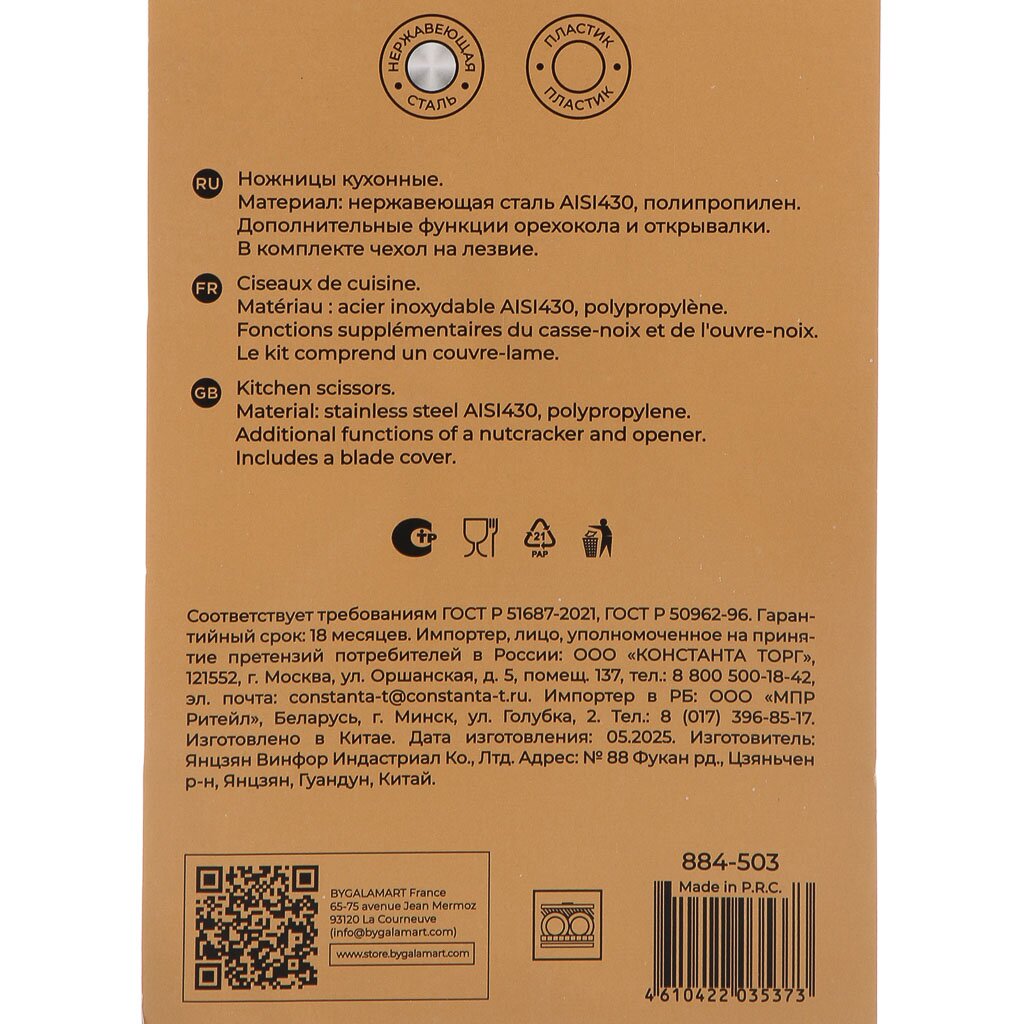 Да, модель оснащена встроенным орехоколом, открывалкой и навеской для хранения. Это делает ножницы многофункциональным инструментом для кухни, дома и подарка.