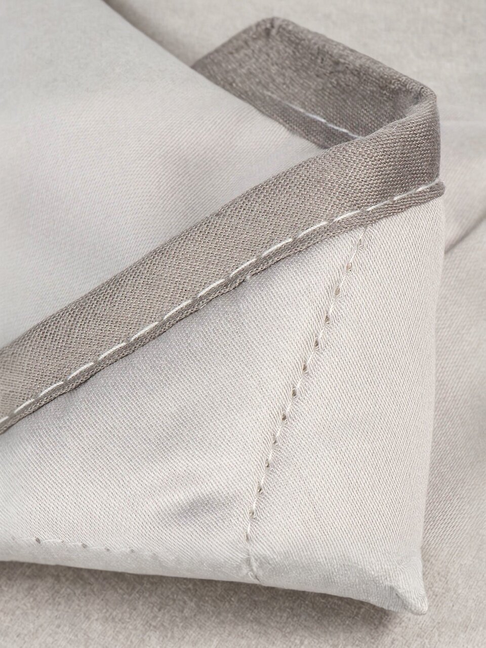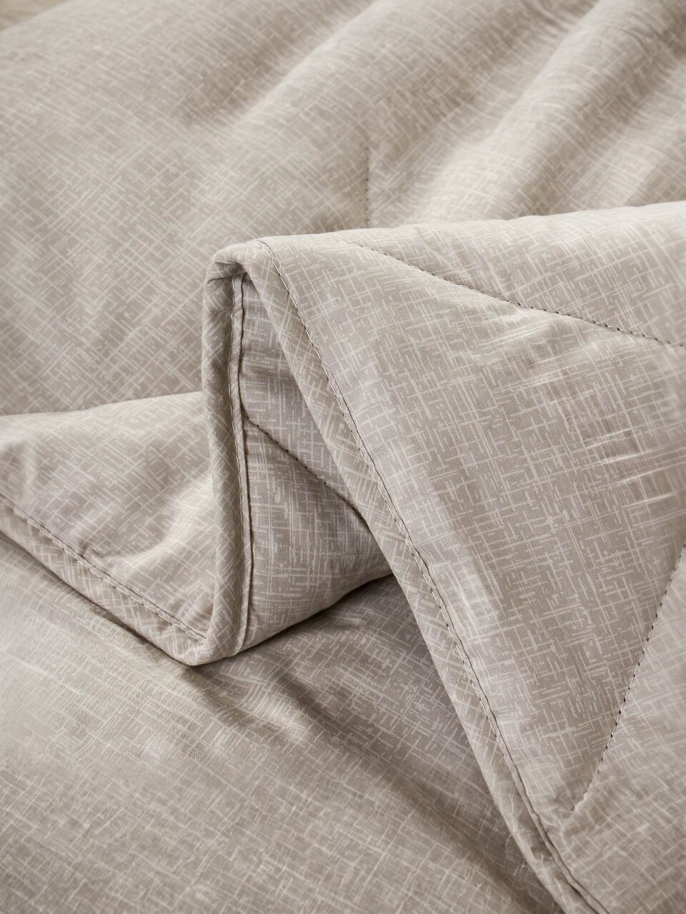 Размер евро — 200х220 см, плотность наполнителя 300 г/м2, толщина средняя. Чехол несъемный, выполнен из сатина и хлопка, цвет серый, стежка классическая, кант по периметру.