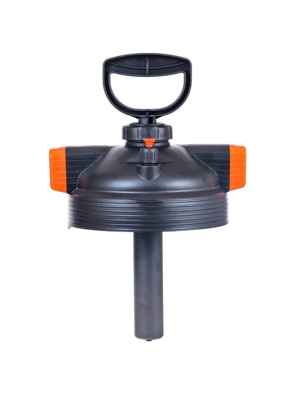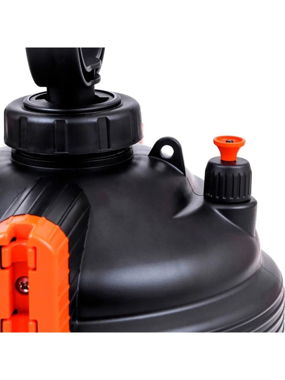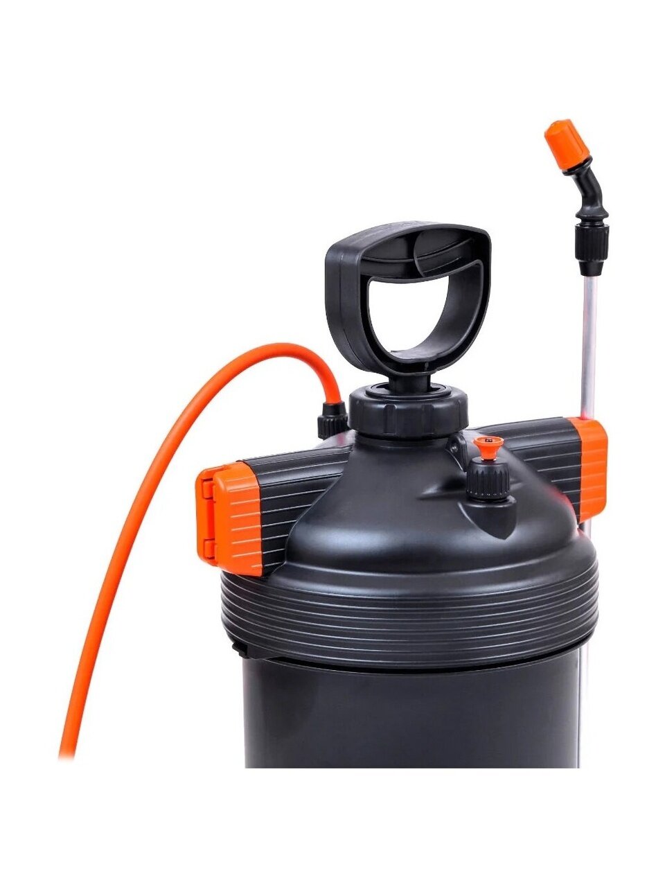 Мерная шкала на баке показывает остаток содержимого. Предохранительный клапан срабатывает при избыточном давлении, что обеспечивает безопасность в процессе эксплуатации опрыскивателя. Алюминиевый брандспойт надежен и удобен в применении. Регулировка струи на брандспойте даёт возможность использовать опрыскиватель как для защиты растений от вредителей, так и для полива.