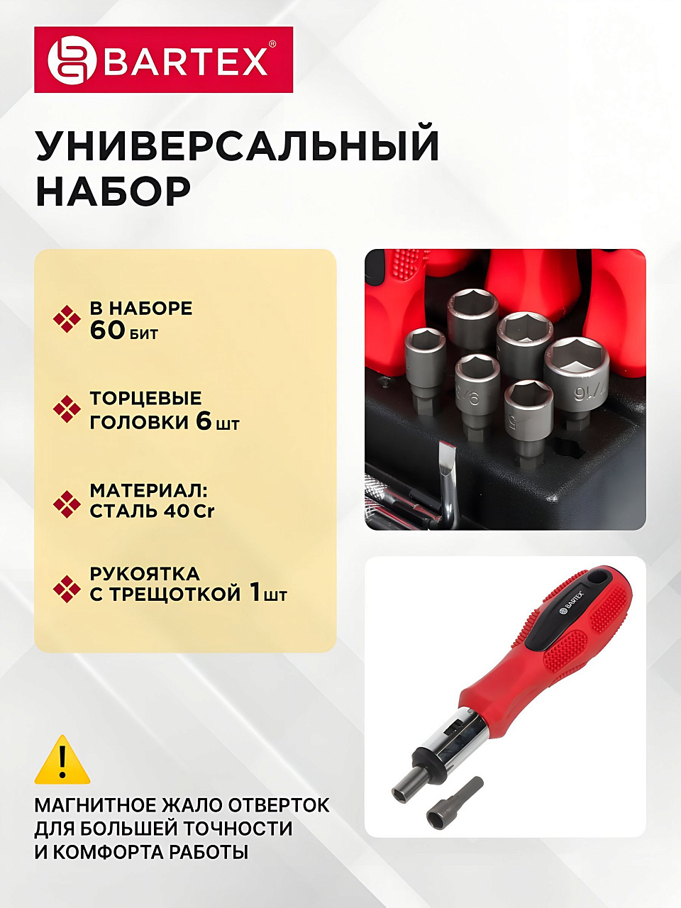 Покупка набора отверток Bartex – это выгода, заключающаяся в универсальности и экономии: один комплект решает множество задач, избавляя от необходимости приобретать отдельные инструменты. Надежность бренда и качество исполнения обеспечивают уверенность в результате. Идеальное решение для тех, кто стремится к порядку и эффективности в домашнем хозяйстве.